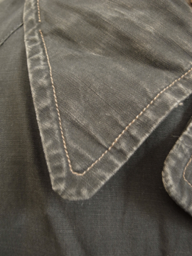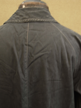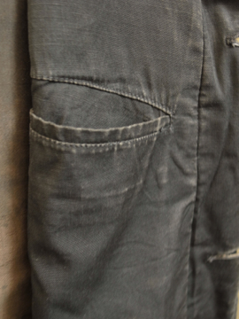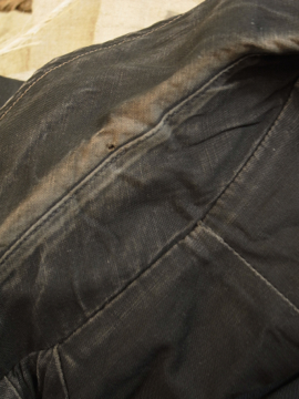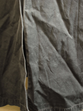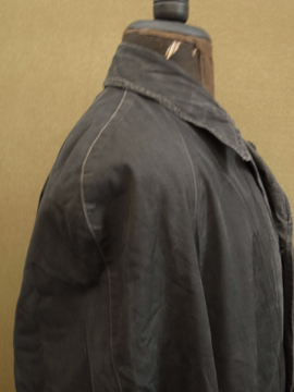 1930年から1940年代頃につくられたワークコート。大きな襟、ロング丈に深いセンターベントのシルエットが綺麗です。つるっとした肌触りの光沢のあるコットン素材です。ラグランで袖口にタブ、左右にポケット。内ポケットもあります。表地と同じ素材の裏地が付いています。襟裏にはステッチが入り、仕立てが丁寧で良いです。全体的に色褪せがあり、襟裏など良く擦れる部分は特に色抜けして小さな穴があります。このような素材のコートは珍しいです。