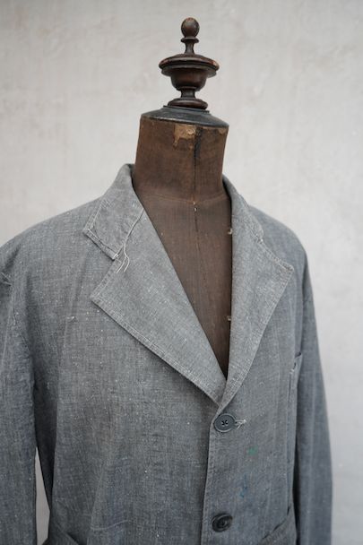 1940年代頃につくられたアトリエ・コート。平織りのリネン・コットン素材、風合いの良い布地です。下方の左右のポケットはVステッチ入り、欠損しがちなベルトも残っています。ボタンが1つつけ替わっています。所々ペイント汚れがありますが、大きなダメージはなく状態は良好です。