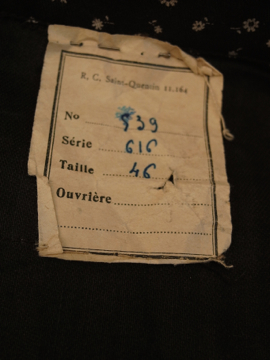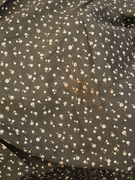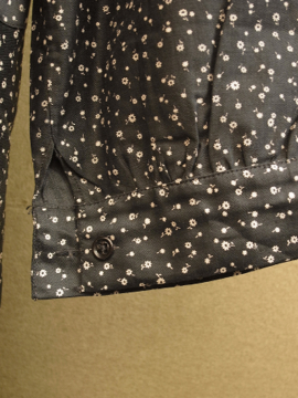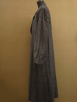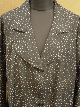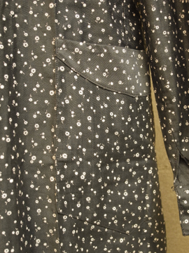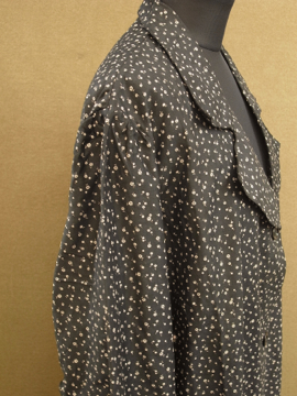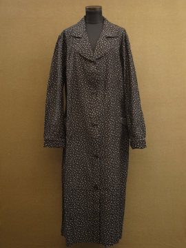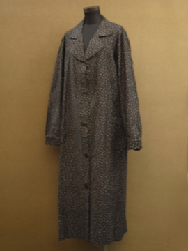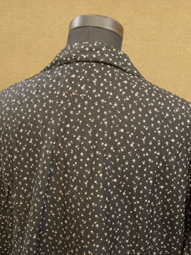 1930年から1940年代頃につくられたワークコート。デッドストックで糊の利いたハリのあるコットン素材。洗濯を繰り返すうちに生地はどんどん柔らかくなっていきます。細かい花柄プリントのコットン地、太い襟で緩いシルエット。ボタンは黒いガラス製。左胸の下方に保管中にできた5cmのシミ、小さな穴があります。使い込んでいくのが楽しみな1着です。