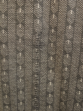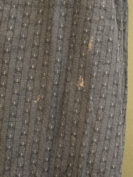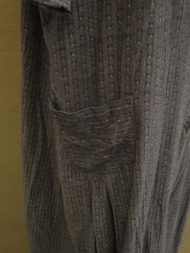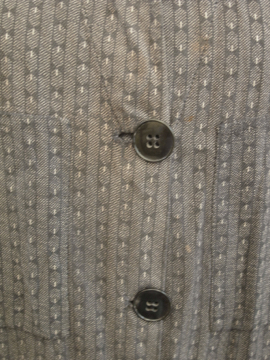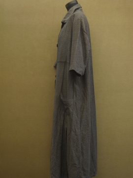 1930年代から1940年代頃につくられたワークコート・ドレス。コットンツイルに細かいドットでつくられたストライプ柄がプリントされた良い布地です。襟部分はに別布が使われているのが面白いです。大きなパッチや穴の補修痕など直しは全て丁寧な手作業です。裾近くに色抜け、その他擦れ、小さな穴、糸のほつれ、染みなど経年の傷みがあります。ダメージを気にされない方にお勧めします。