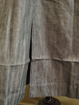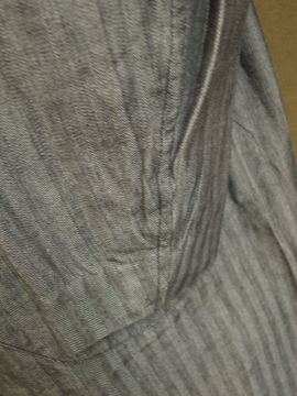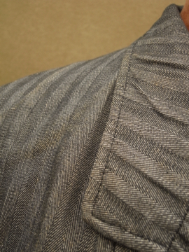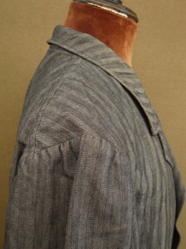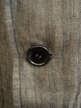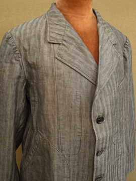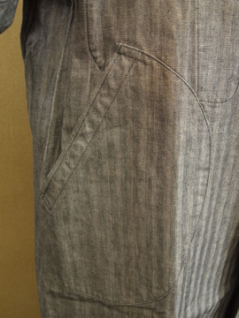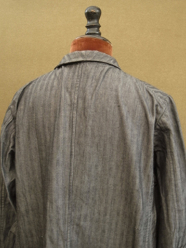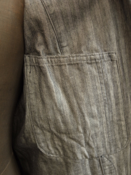 1930年から1940年代頃につくられたワークコート。ヘリンボーン織りのごま塩、リネンとコットンの混合素材です。つやと程よいハリのある良い布地で、アトリエコートの中でもこのような素材のものは大変珍しいです。斜めの口の胸のポケット、左右の大きなD型ポケットの形も面白いです。両胸に内ポケットがあります。裏にステッチの入った襟も良いです。プラスチック製ボタン、ボタンホールは手縫いです。おそらく未使用品で状態はとても良いです。