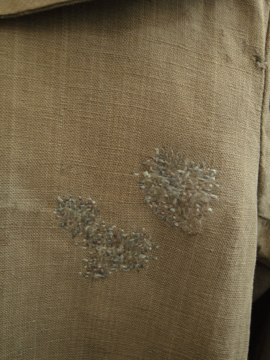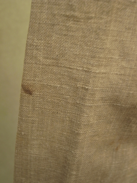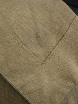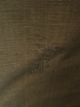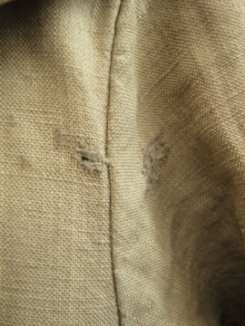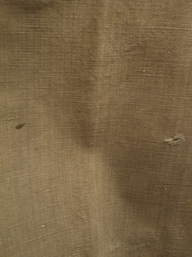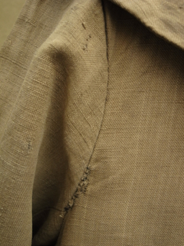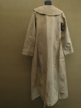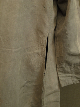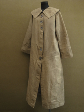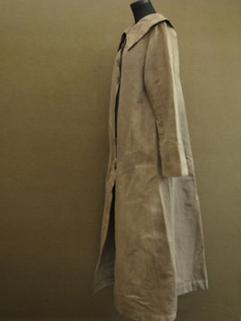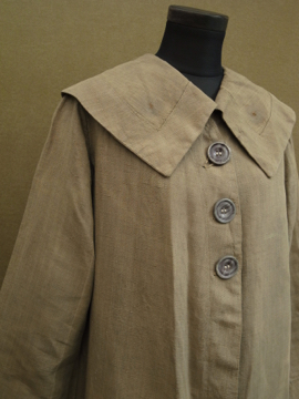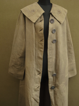 1910年から1920年代頃につくられた女性用ドライビング・コート。カーキ色のリネン地、とても珍しい色の素材です。大きな襟にカーブした前立て、ウエストから下に広がるシルエットが女性的で美しいコート。ボタンはマーブルに塗られたメタル製、一部付け変わっています。斜めについたボタンホールは手縫い。襟や袖口にボタンのついていた跡のサビ染みがあります。身頃サイドにコート内にアクセスするスラッシュがあります。バック右に大きな直し痕が数カ所、全体的に穴や直し痕が多数あります。傷みがありますが、とても良い品です。直しながらご愛用できる方、ダメージを気にされない方にお勧めします。