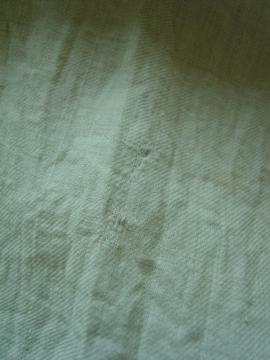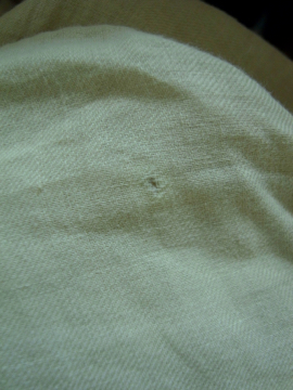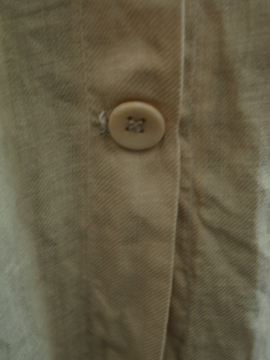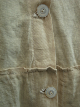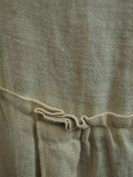 19世紀後期頃につくられたフード付き女性用スモック/コート。コットン地のような風合いのある薄いリネン素材、多少コットン混かもしれません。イエローベージュの色目も良いです。大きなフードは先の尖った形でフロントが女性らしいデザインになっています。フロントを5つのボタン留め、裾の方は開いています。ボタンはボーン製とシェル製のもの、ボタンホールは手縫い。 小さな穴、擦れ、シミが少しありますが、状態は良いと思います。