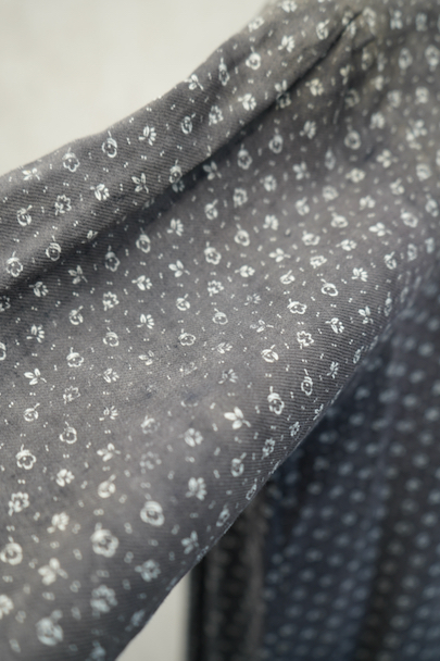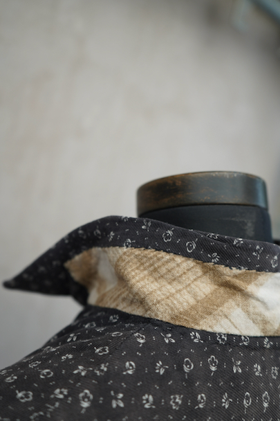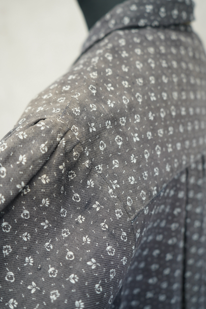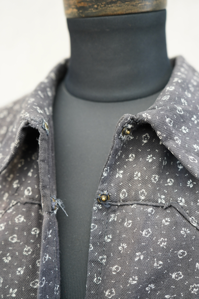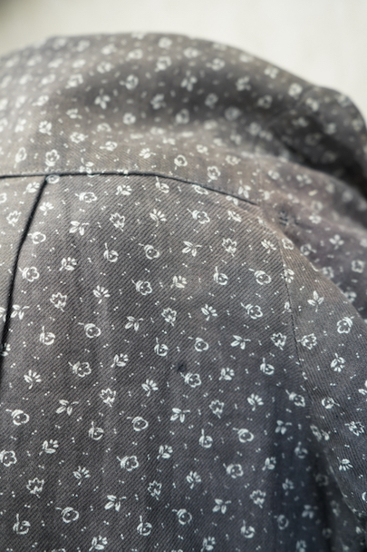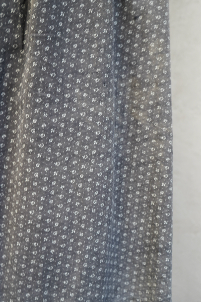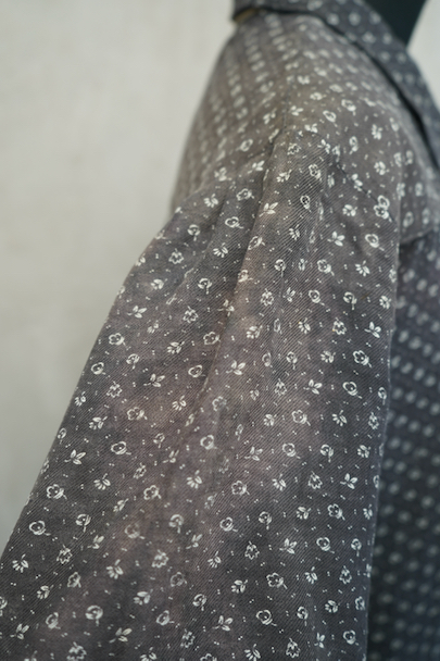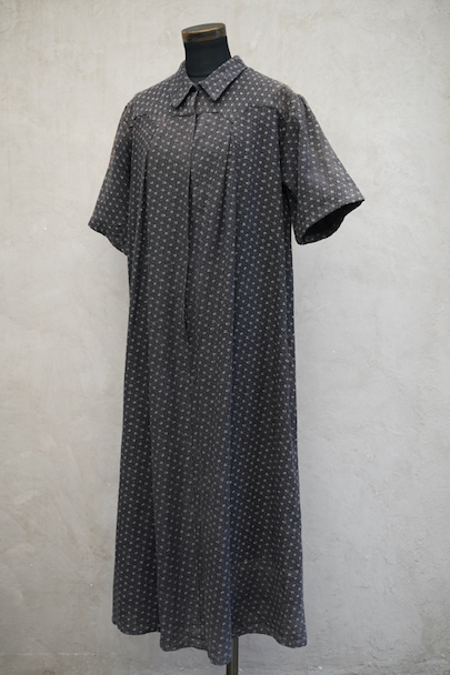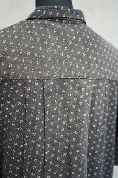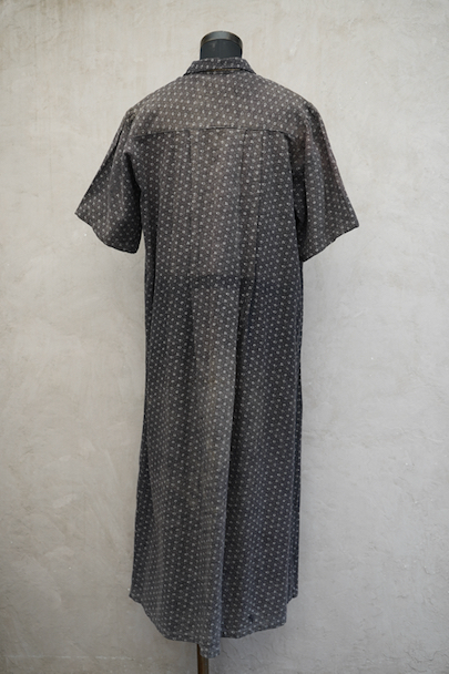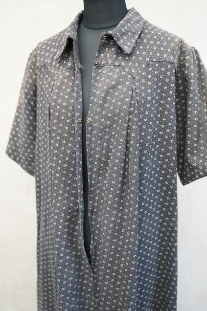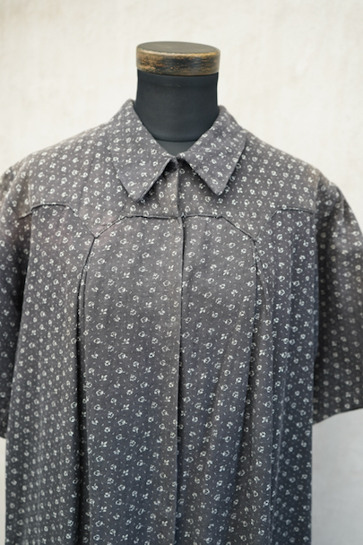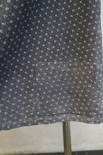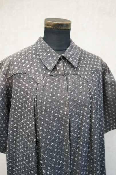 1930年代から1940年代頃につくられた半袖ワークドレス。花柄のコットン素材です。フロントはスナップボタンで留める仕様、フロントトップから49cmまで開くので着脱しやすいです。全体的に色焼けや、擦れ、直し痕、小さな穴、共布のパッチワークなどかなりの使用感があります。使い込まれた風合いが時代を感じる良い風合いとなっています。ダメージを味として楽しんでいただける方にお勧めです。