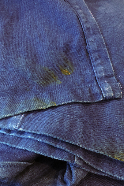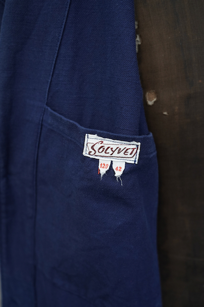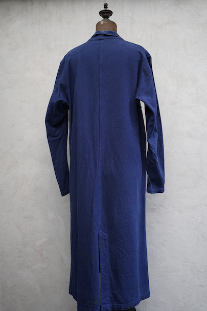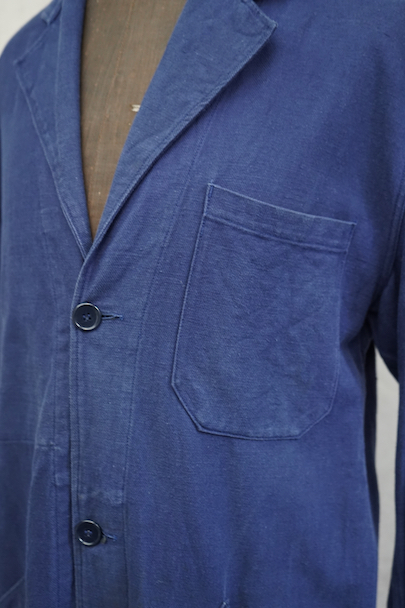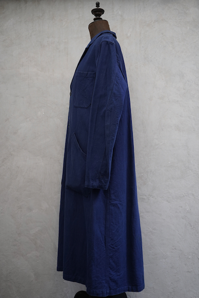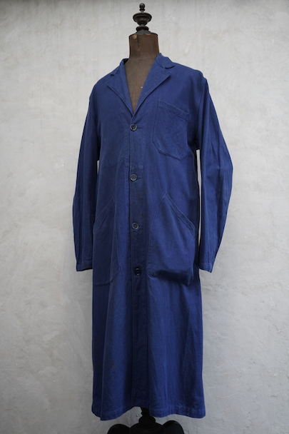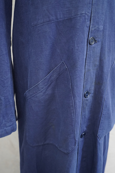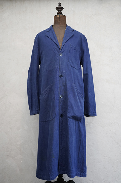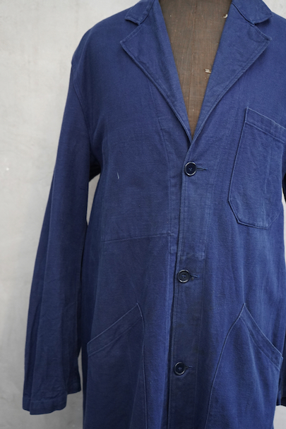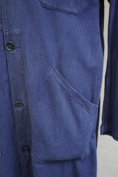 20世紀中期頃につくられた ワークコート。ネイビーブルーのコットン・ツイル、柔らかさのある良い生地感の布地です。フロントに3つの大きなパッチポケット、内ポケットが一つ。立体的な袖、比較的長めの丈で綺麗なシルエットです。小さなペンキ汚れ、裾近くにサビ染み、全体的に多少の薄いシミ、若干の汚れ、擦れやほつれがある等の使用感はあります意外とこのような生地感のブルー・コットンでつくられたワークコートは数が少ないです。
