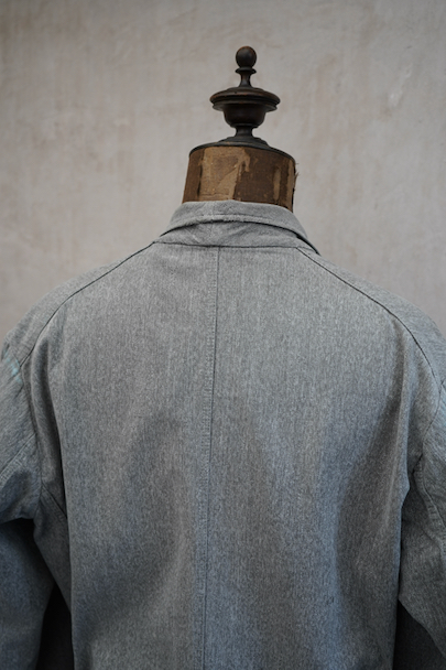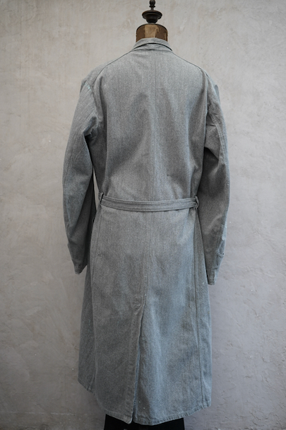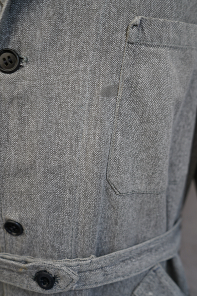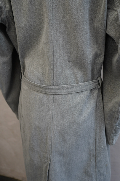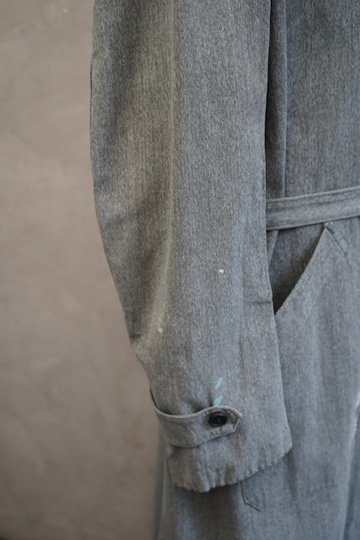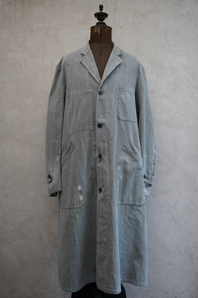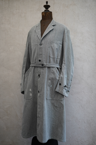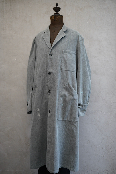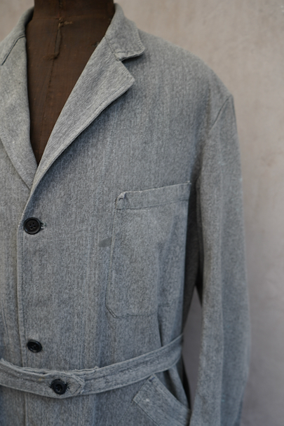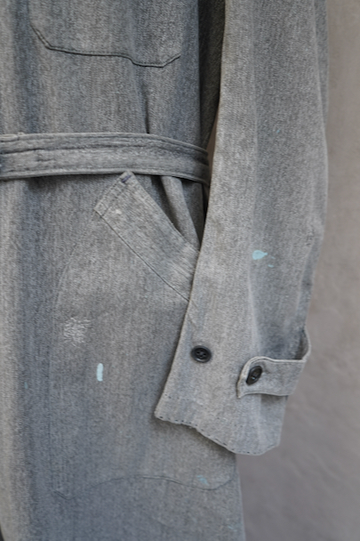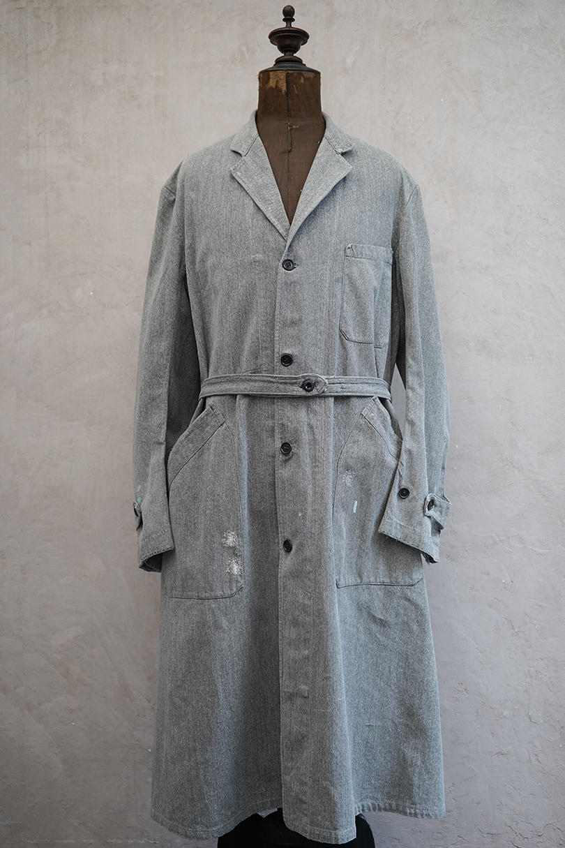20世紀中期頃につくられたごま塩コットン素材のワーク・コート。"Au Molinel"製、刺繍タグがついています。少し傾斜のついた胸のポケット、袖口にタブなど良いディテール、欠損しがちなウエストのベルトも残っています。左右のポケットに手縫いの直し痕、全体的に多少のペンキ汚れがあります。袖口や襟などに擦れ、バック中央あたりに小穴がある等の使用感があります。