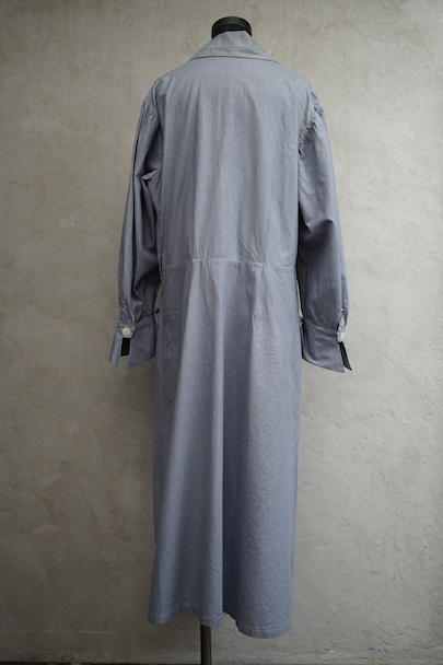 1940年代頃までにつくられた女性用ワークコート。比較的薄手の軽いコットン素材で、シルク混のような柔らかくしっとりとした風合いです。ブルーグレーで若干光沢のある布地はしわ加工されたような独特の質感です。汚れよけとして使用されたっものですが、凝ったデザインの良い品です。バックに赤いペンキや錆のようなシミが数か所あります。その他裾近くに1cmの穴が2個、小さな点のような穴が多数あります。