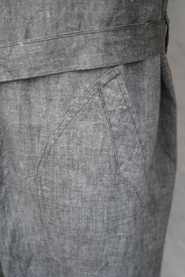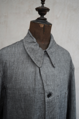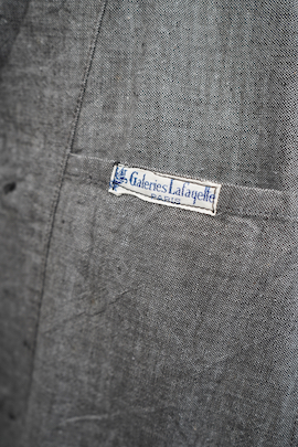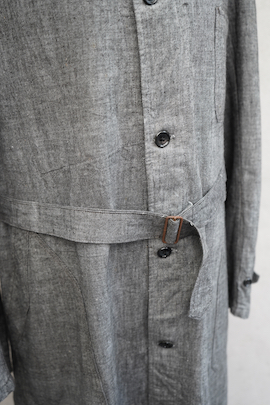 1940年代から1950年代頃につくられたアトリエコート。"Galeries Lafayette"のタグがついています。平織りのリネン・コットン素材、風合いの良い布地です。襟のトップまでボタン留め、袖口にタブ。下方の左右のポケットはVステッチ入り。欠損しがちなベルトも残っています。未使用のように使用感はないですが、裾部分に丈上げを解いた跡が色が薄いラインになっています。