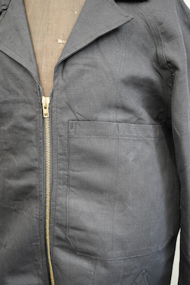 20世紀中期頃につくられたブラック・リネン・マキニョン・コート。タグに"La Montagnarde"とあります。デッドストック。フロントがファスナーで開閉するとても珍しい仕様、胸にこのタイプのコート特有の2連ポケットがありますが、こちらは大きなポケットがステッチで分けられたタイプ。ラグラン・スリーブ、立体的な袖のつくり、袖口にタブ。左右に大きなポケット、サイドベント。薄い汚れはありますが、状態は良いです。
