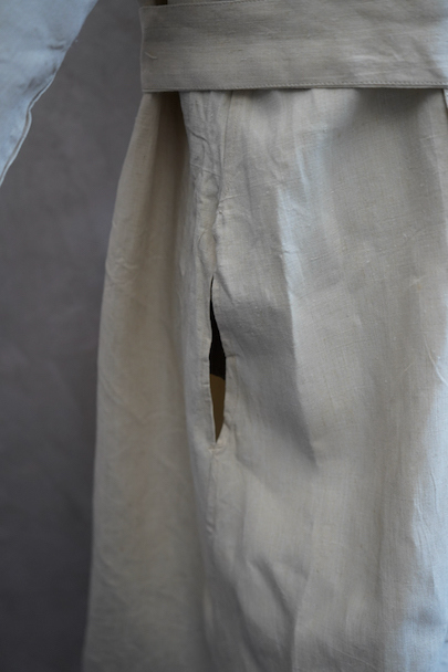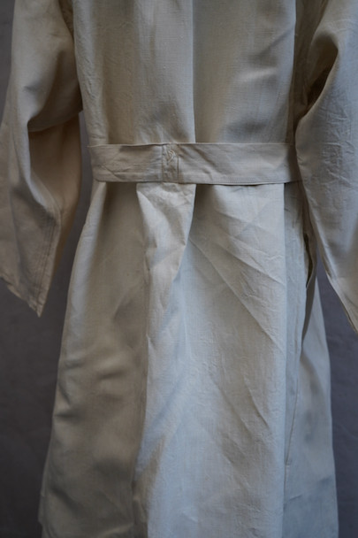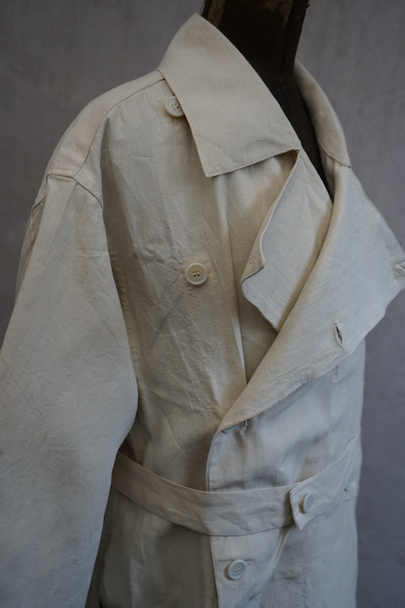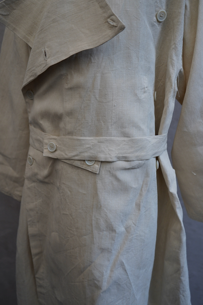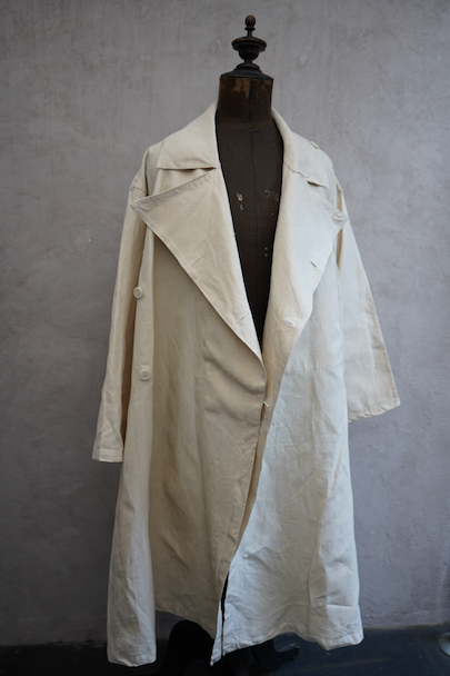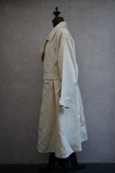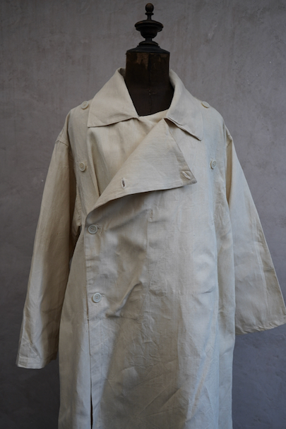 1950年代につくられた フランス軍のH.M.ダブルブレスト・コート。100%リネン素材が使われている珍しい品です。 弾力のある良い布地、デッドストックを一度洗濯しています。大きく肩まで留める幅広のダブルブレスト、留める部分によって襟の色々な表情が楽しめます。バック上部の切り替え下にギャザーが入り布が多く使われたデザイン、ベルトをすると引き締まります。ボタンは白い樹脂製、ウエストのベルトはバックで縫い付けられています。左右にコート内にアクセスするためのスラッシュ、内ポケットが1つ。状態は良いです。
