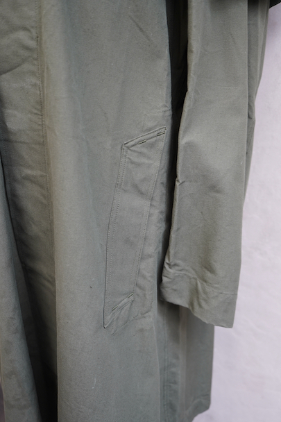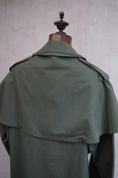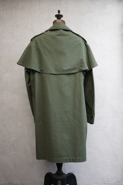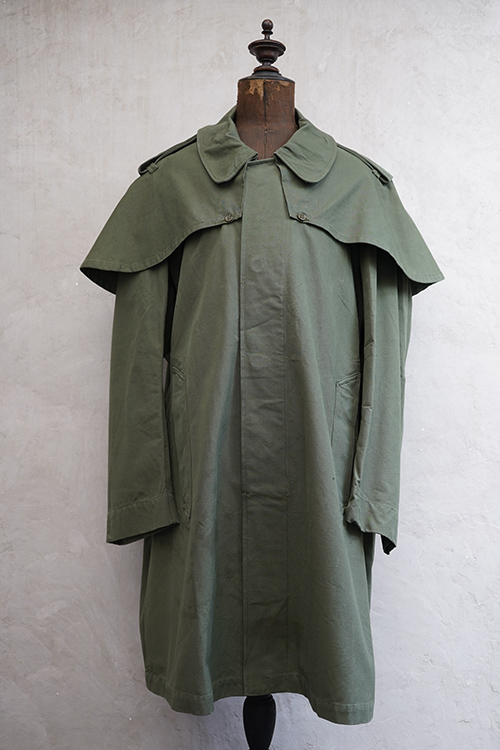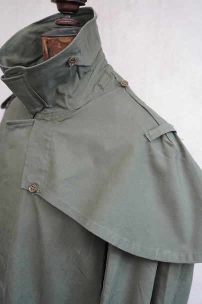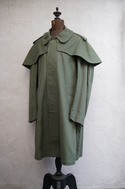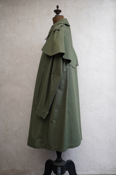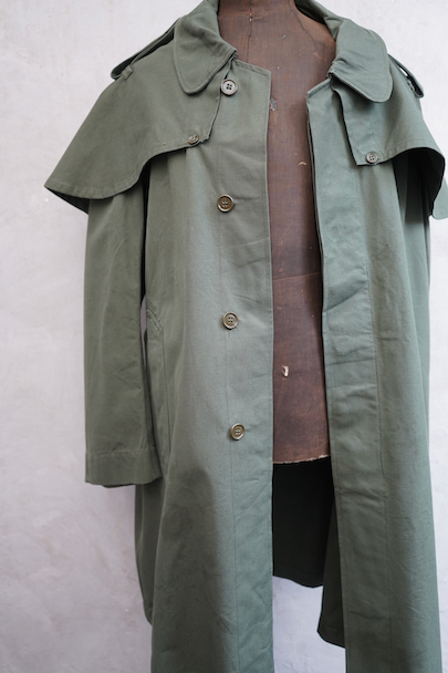 1960年代頃につくられたフランス軍のケープ付きコート。未使用品です。オリーブ・カラーのコットン素材、綺麗な形のコートです。肩のエポレットは取り外しできますが、ケープは取り外しできません。フロントは比翼仕立て、ラグランのピボット・スリーブ。襟裏にはチンストラップがついています。左右についているのは内部にアクセスするための貫通ポケットです。状態は良いです。