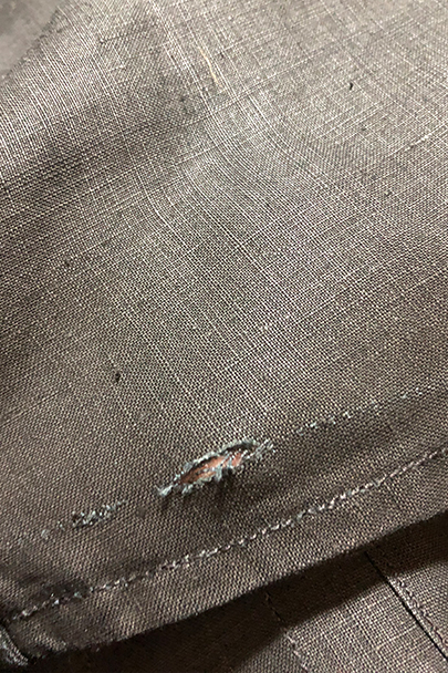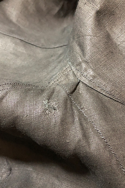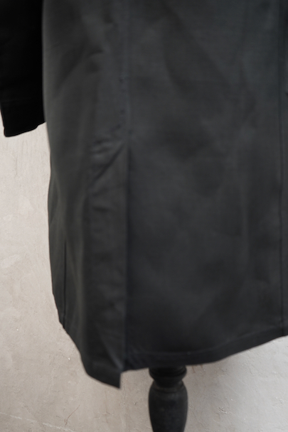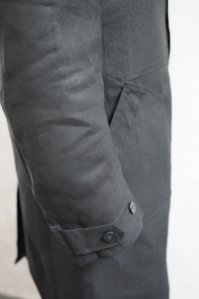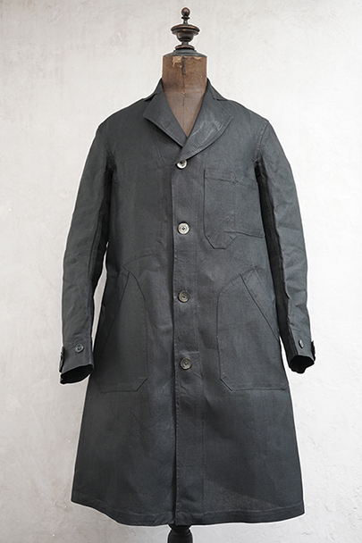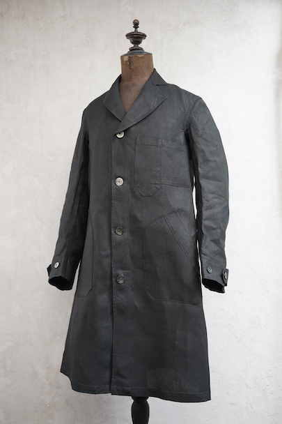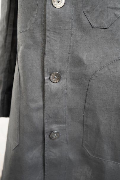 1930年代頃につくられたワークコート。美しいインディゴ染めリネン素材、ハリがあり目の詰まった良い風合いの布地です。胸に2連のポケット、このタイプ特有のハサミ用ポケットがついています。袖口にタブ、ボタンは黒蝶貝、内ポケットが1つ。下方左右に大きなポケット、その外側にはコート内部にアクセスするための開きがあります。サイズは小さめです。右肩に約1cmの直し痕、左袖に引っ掻いたような傷があり深い部分は穴が開いています(最大で1.5cm)。その他は使用感がなく未使用品のようです。