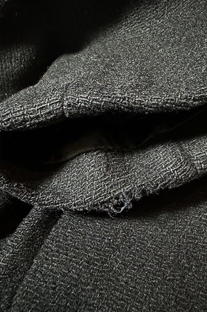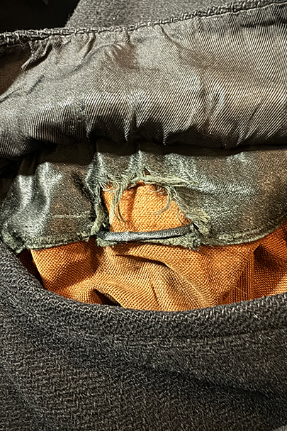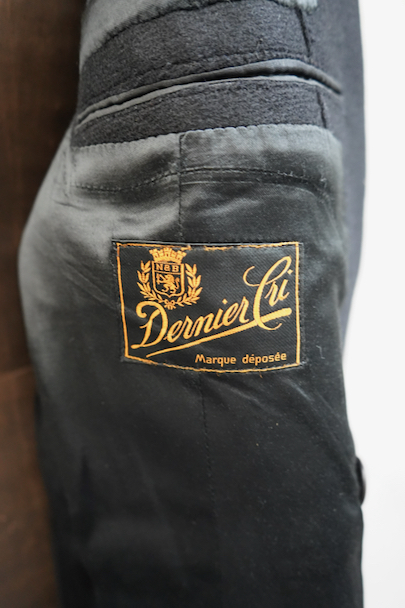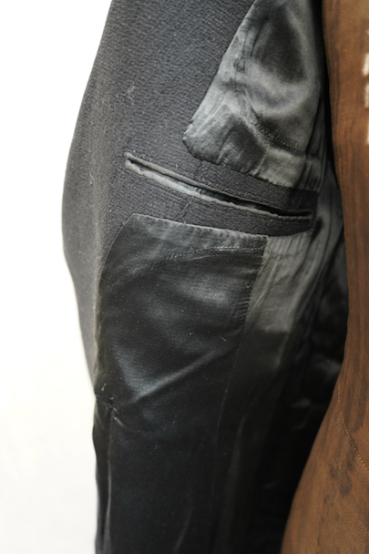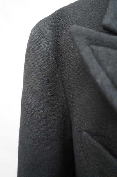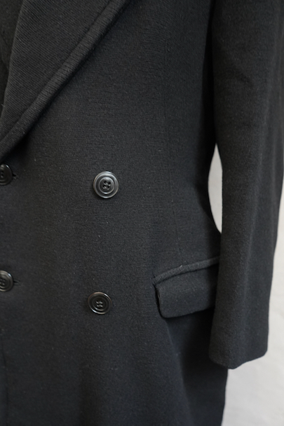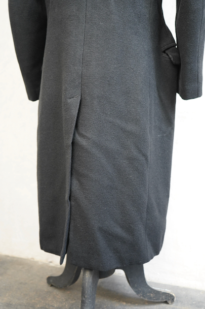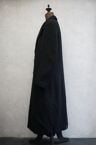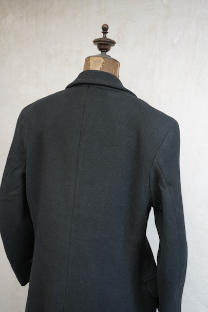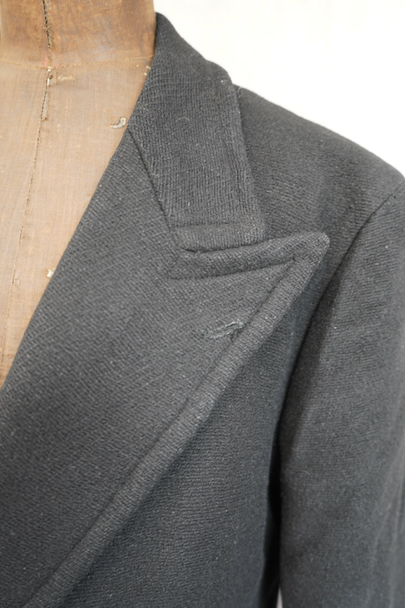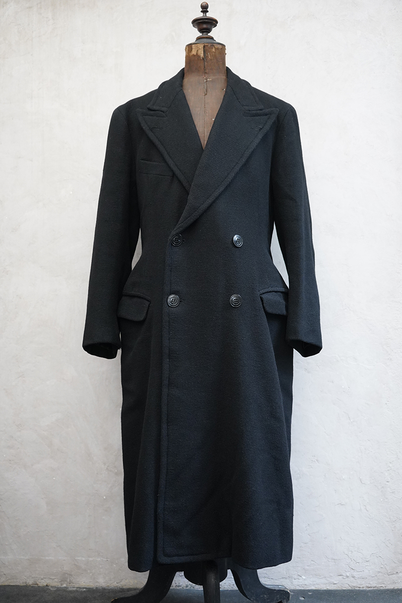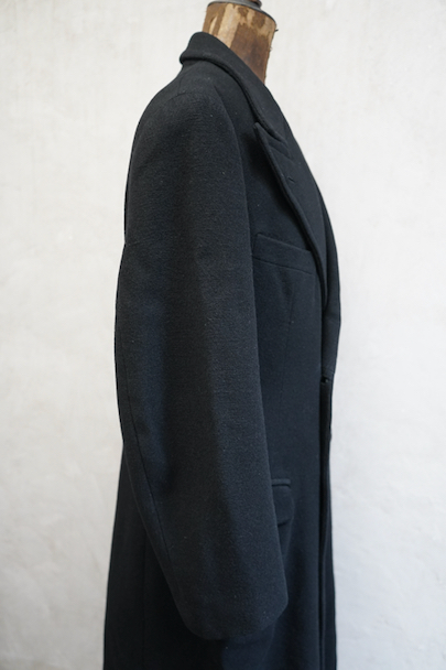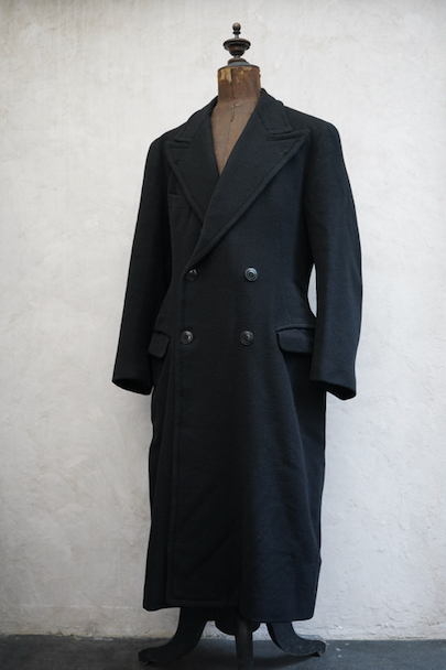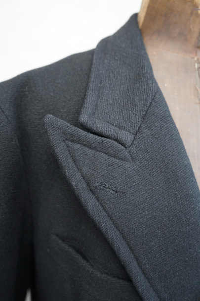 1930年代から1940年代頃につくられたウールコート。大きなラペルのピークドラペルの襟、シェイプされたウエストから裾に向かって綺麗に広がるスタイルです。ボタンはコロゾ製。ダメージは目立ちにくいですが、表地に穴が数ヶ所、袖口に擦り切れ、サイドのポケット内側に大きな擦れた傷み(ポケットは使えます)、裏地に擦れがあります。