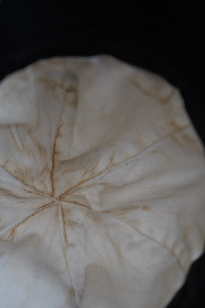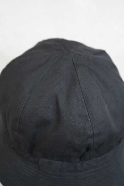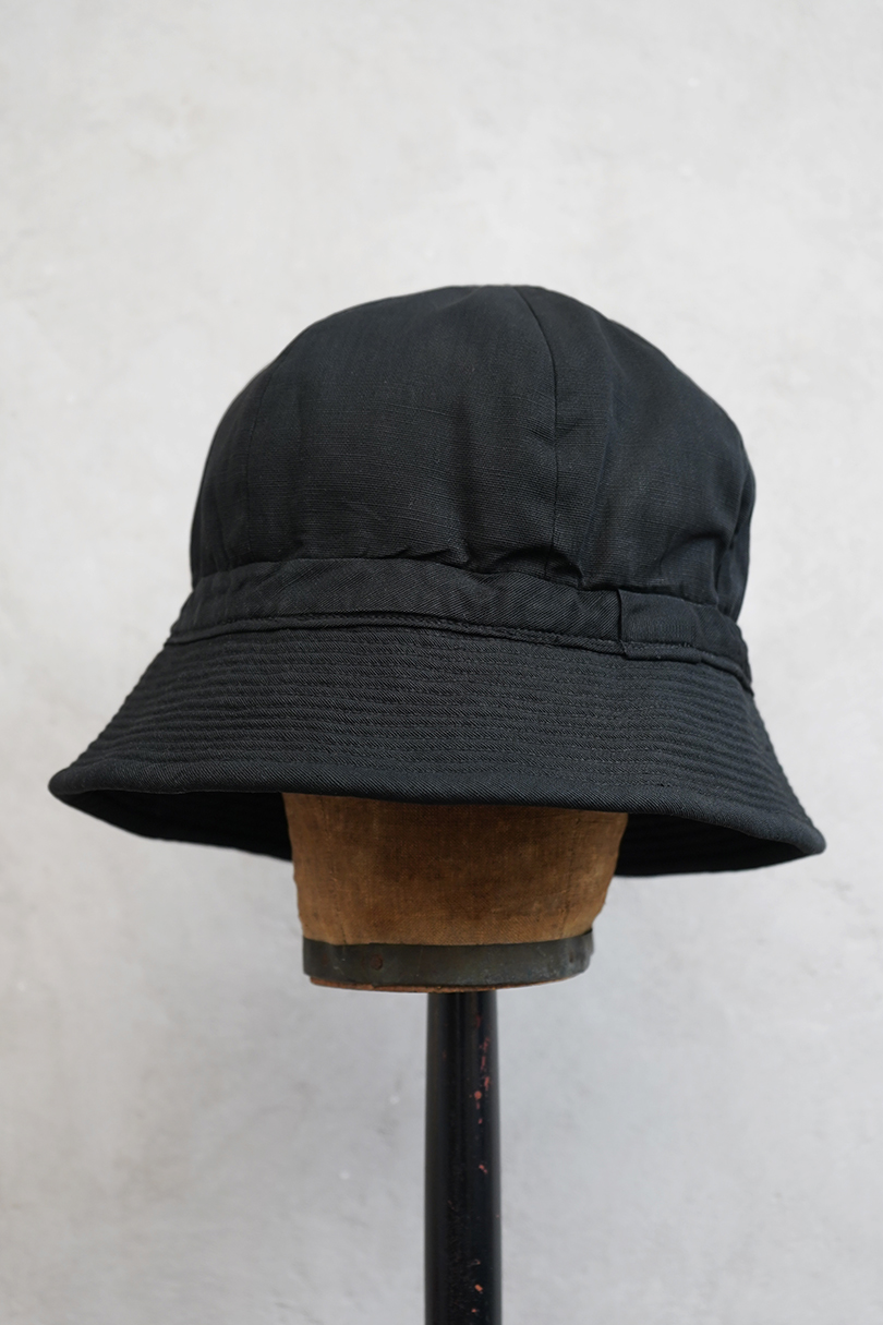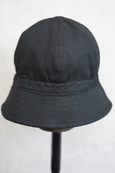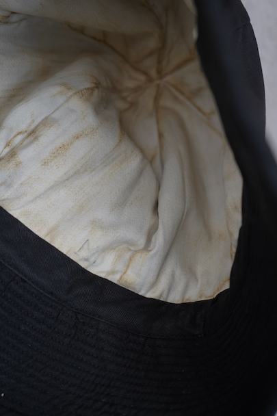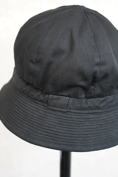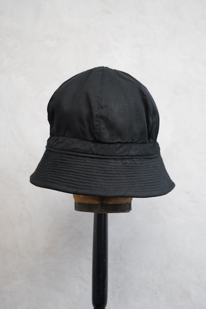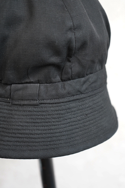 つばの部分に細かいステッチが入ったハット。1930年代から1940年代頃のものだと思います。黒い布地はコットンかリネンだと思いますが、少し艶のありますので糊がきいているか、ウールが入っているのかもしれません。 クラウン部分に丸みと深さがあり面白い形です。つば部分の内側に薄く色落ち、白い裏地に汚れがあります。