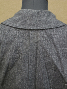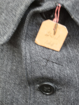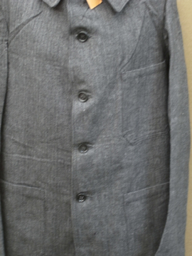 1930年から1940年代頃につくられたグレーのコットン・ジャケット。デッドストックです。ヘリンボーン織りの風合いの良い生地です。幅の広いカーブした襟、タイトな上部から裾にかけてゆったりとしたAラインのシルエットが良いです。フロントに3つのポケット、内ポケットが1つ。ボタンはプラスチック製、一部のボタンに欠けがあります。メンズのSからMサイズ、初めて水通しする際に多少縮む可能性があります。状態は良いです。