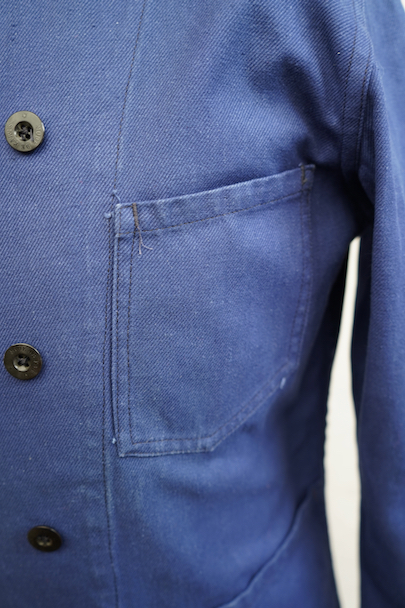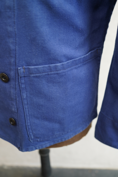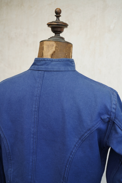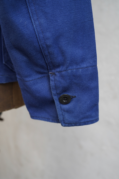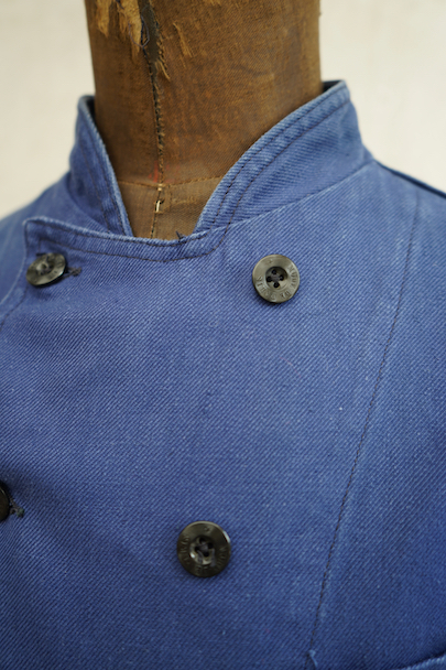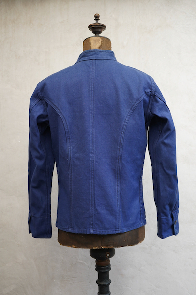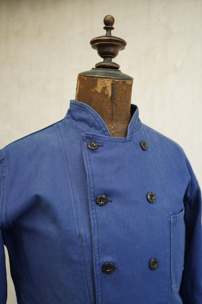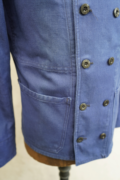 1940年代頃につくられたダブルブレストのワークジャケット。コットン・ツイル素材。スタンドカラーで、身体にフィットする精悍な印象のシルエット。斜めの胸のポケット、右胸に内ポケットもあります。使用感はなく状態は良いです。このようなジャケットは希少です。