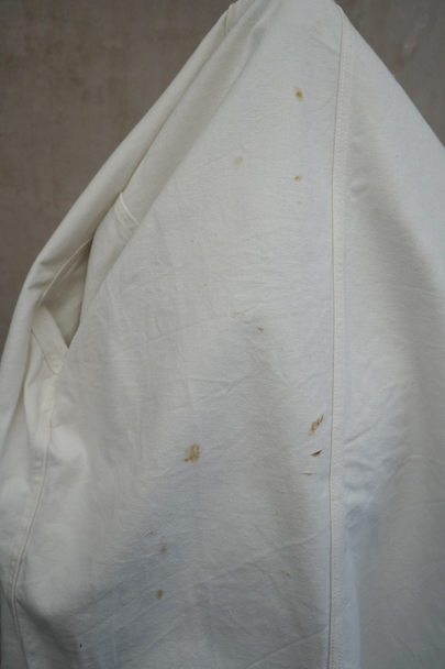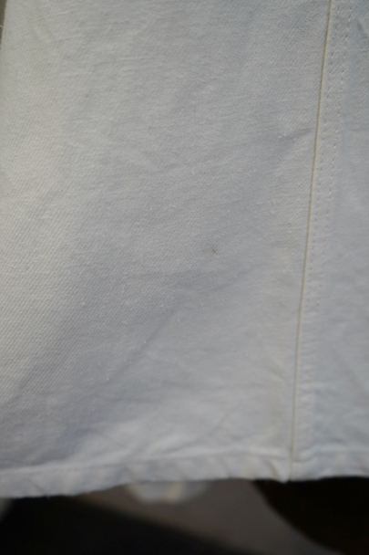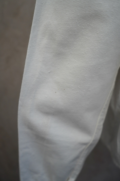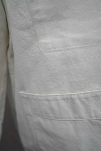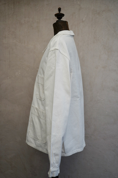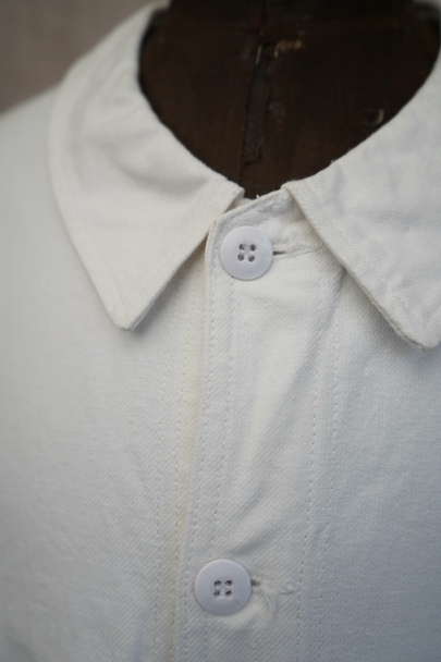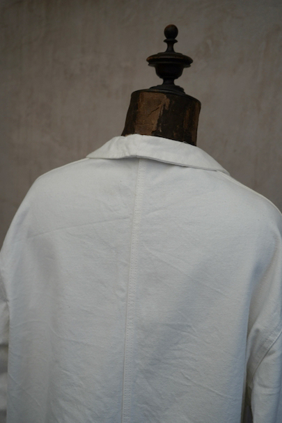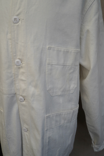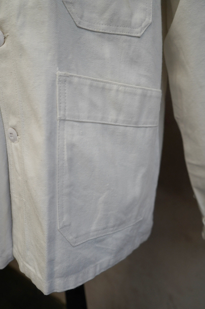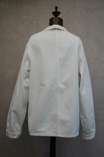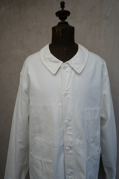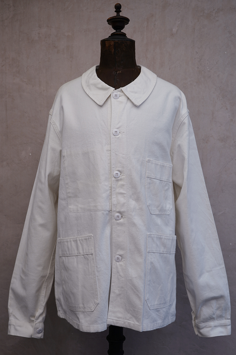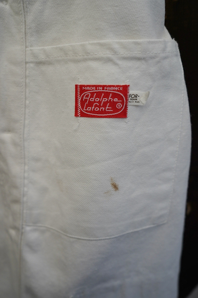 1960年代以降につくられた白いコットン・ツイルのワーク。ジャケット。リヨンの老舗ワークウエア・メーカー"Adolphe Lafont"製です。年代は浅めですが、しっかりとフレンチワークらしい丸くカーブした襟です。表記サイズは50。内側にシミがありますが、表まで染みていません。多少の使用感はありますが、大きなダメージはなく状態は良いです。