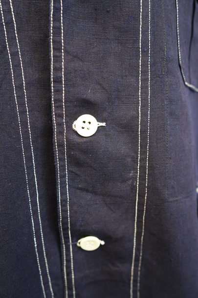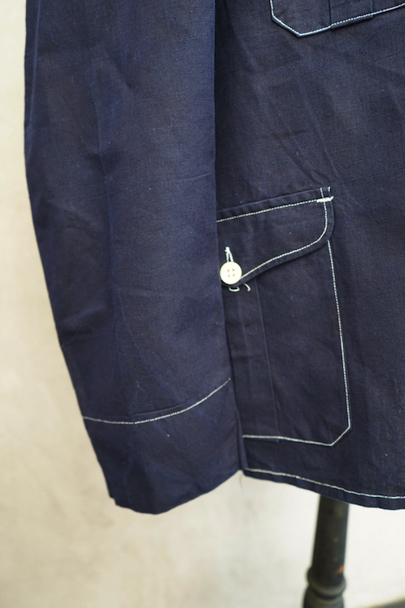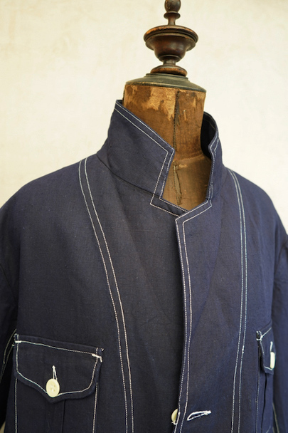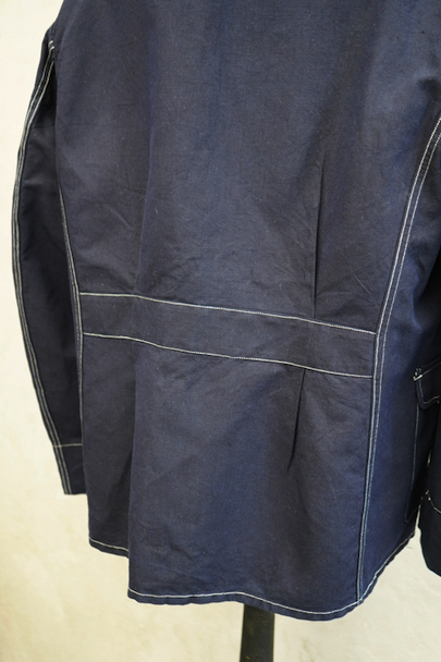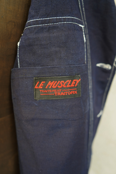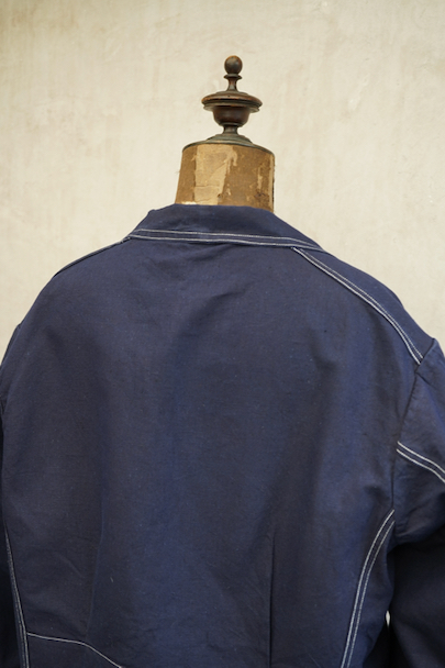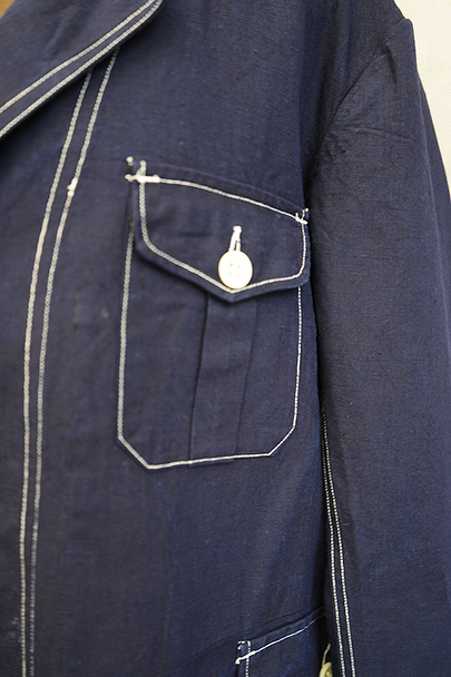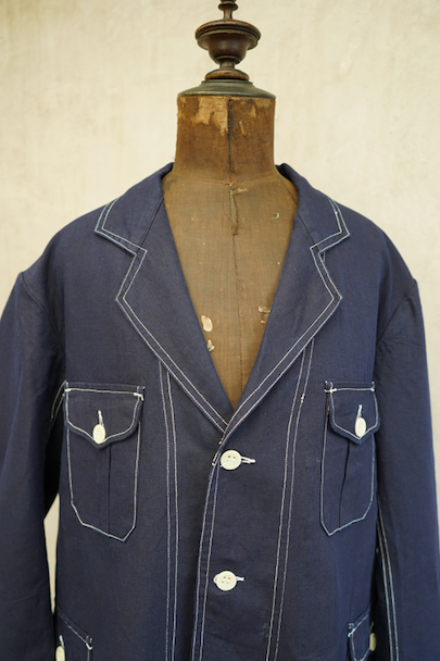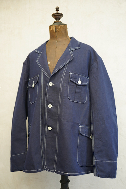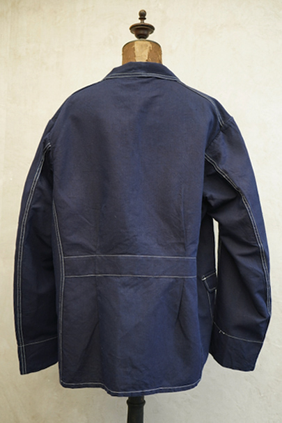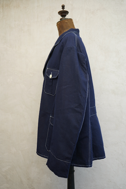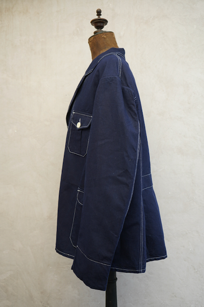 1940年代頃につくられたラペルド・タイプのワーク・ジャケット。未使用品を一度洗濯しています。ネイビー・カラーのリネン・コットン素材に白ステッチが映えます。4つのボタン留めフラップポケット、バックにマルタンガル。"LE MUSCLEY"というメーカー・タグがついています。ボタンは白いガラス製。保管中の傷みはなく、状態はとても良いです。