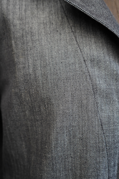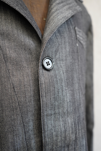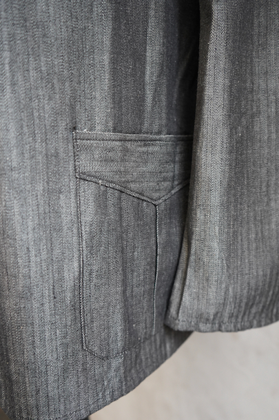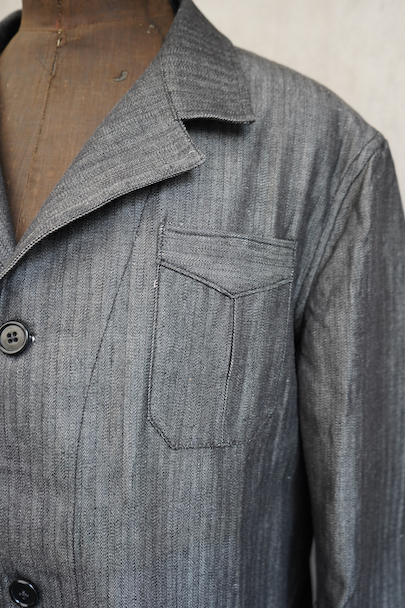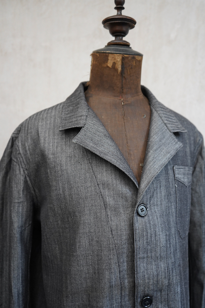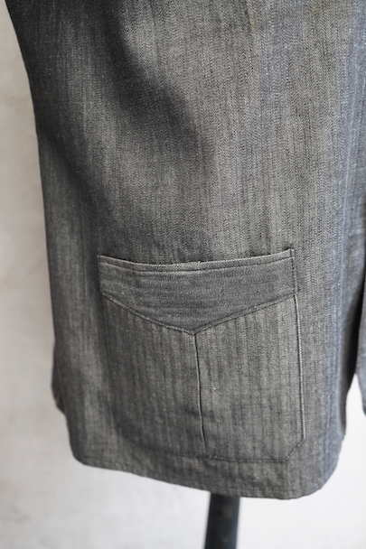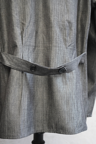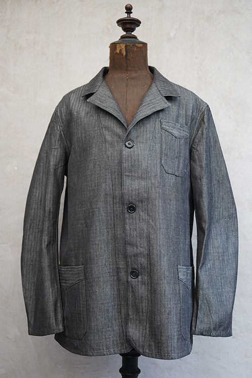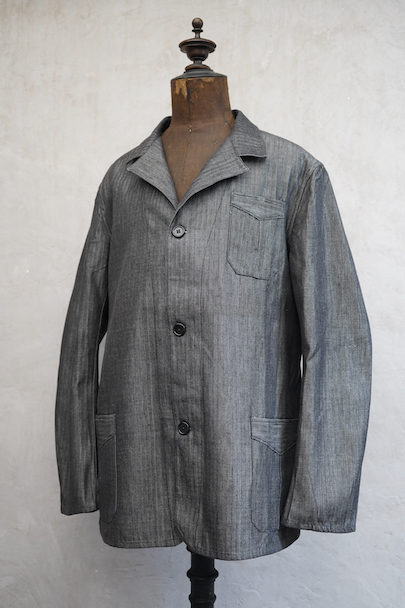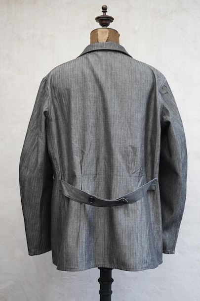 1940年代頃につくられたワーク・ジャケット。ごま塩のヘリンボーン・ツイル、光沢のあるコットン素材、おそらくベルギー辺りのものだと思います。未使用品を一度洗濯しています。Vヘムのインバーテッド・プリーツのポケット、フロントは3つボタン留め、バック・ベルトがついています。状態は良いです。