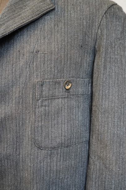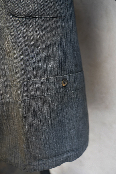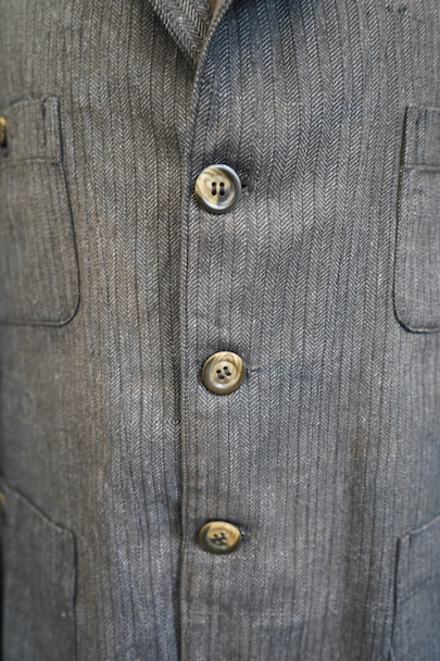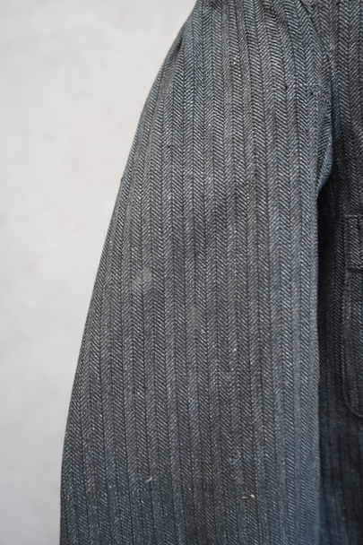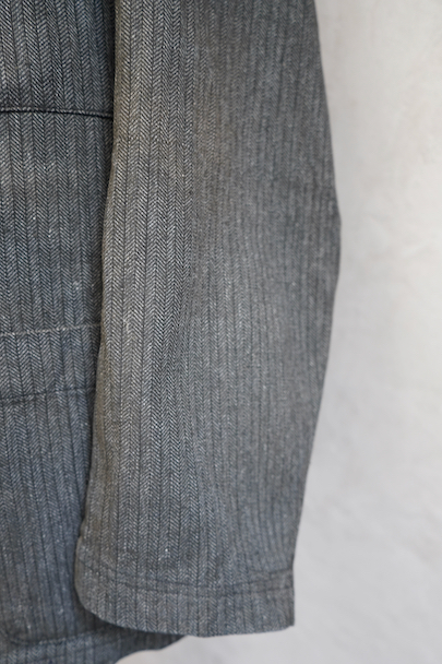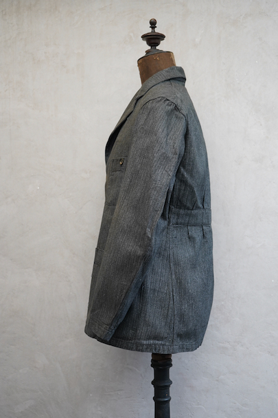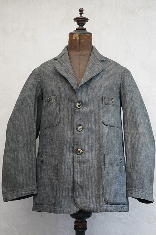 1930年代頃につくられたボタン留めの4ポケットのラペルド・ジャケット。未使用品を一度洗濯しています。バックにマルタンガル、立体的で綺麗な形です。ストライプ・ヘリンボーン・ツイル・コットン素材、良い布地です。ボタンはコロゾナット、ボタンホールは手縫い。サイズ42と表記のタグがあります、色焼けや多少の汚れがあります。