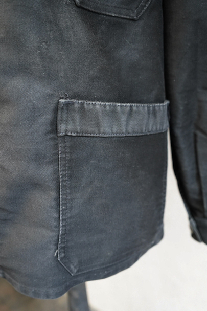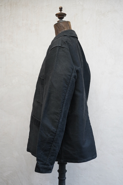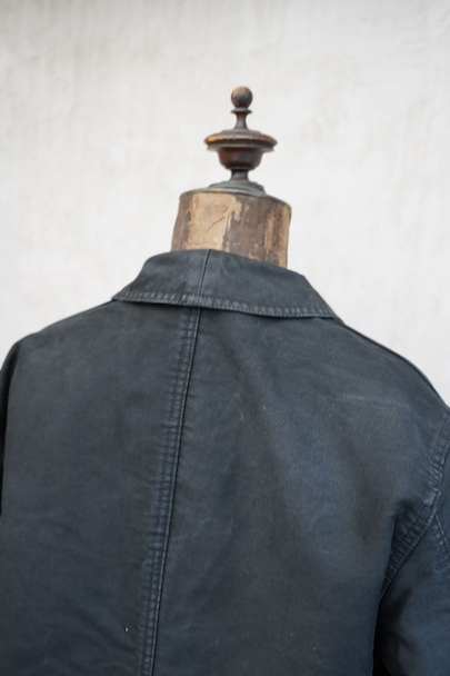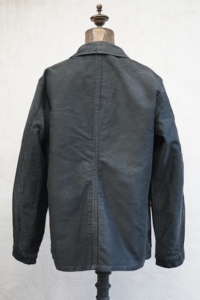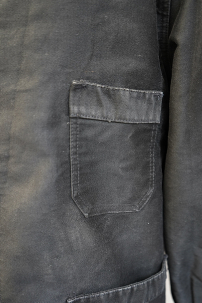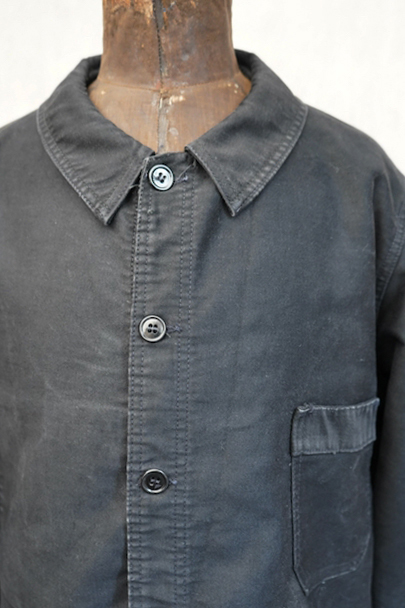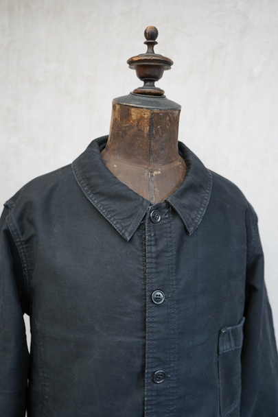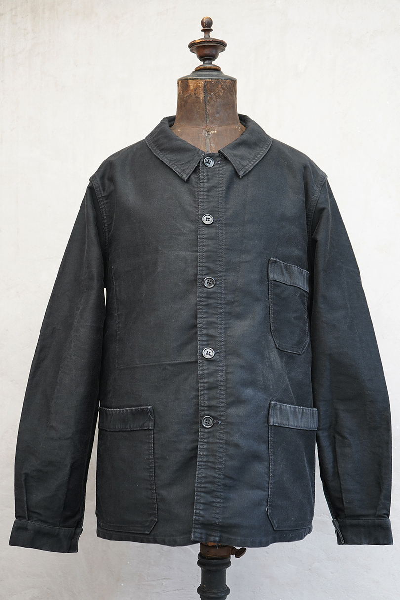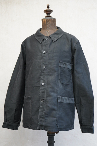 20世紀中期頃につくられたブラック・モールスキン・ワークジャケット。"CREPIER"刺繍タグがついています。フレンチワークらしい丸くカーブした襟。胸ポケットの下方などに多少の擦れや傷などはありますが、全体的に使用感は少なく状態は良好です。