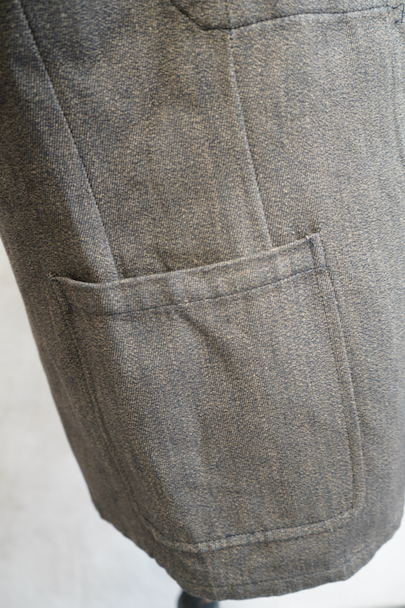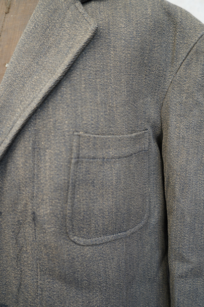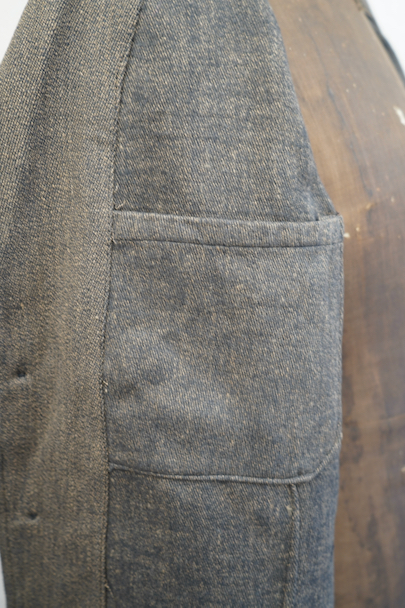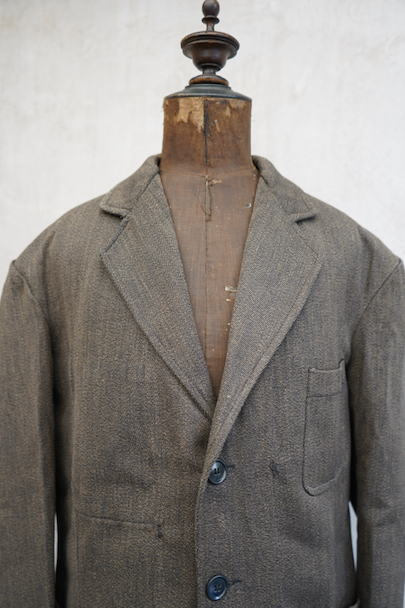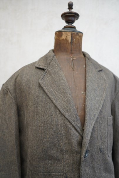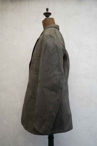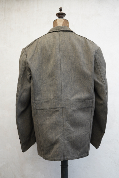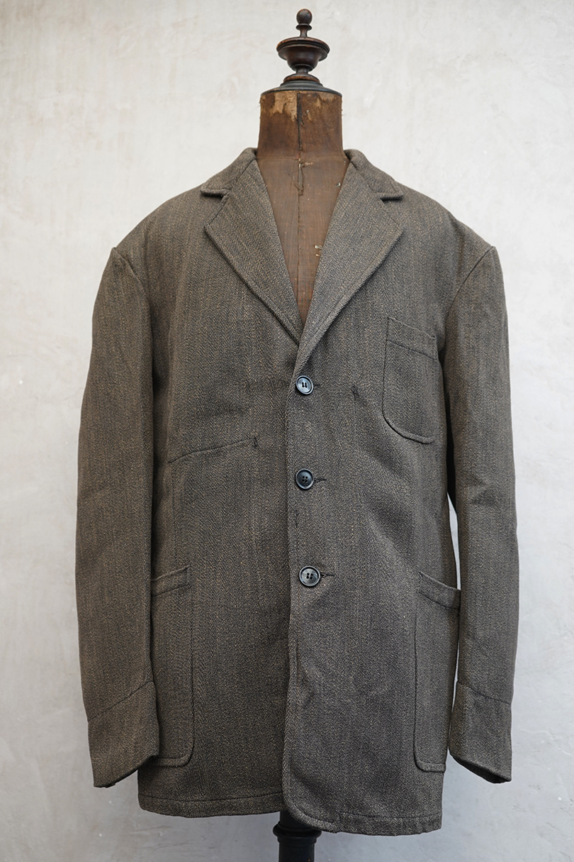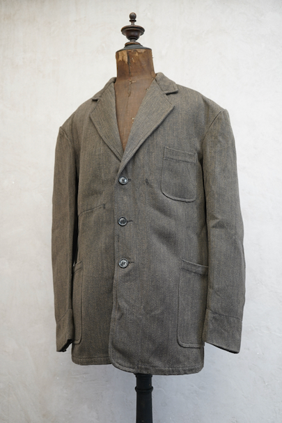 1940年代頃につくられたごま塩ブラウンのラペルどのワークジャケット。デッドストックを一度洗濯しています。少し裏起毛した柔らかさのあるコットン素材、少しシャリ感があるのでウール混かもしれません。フロントは3つボタン留め、バックにマルタンガル。少し丸みのある3つのパッチポケット。保管中のダメージはなく、状態はとても良いです。