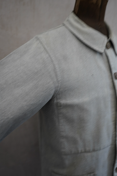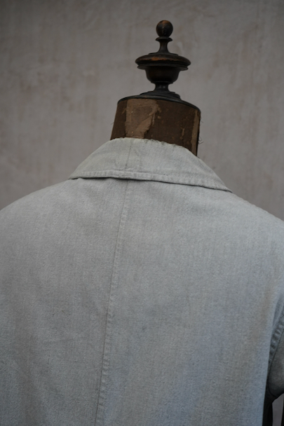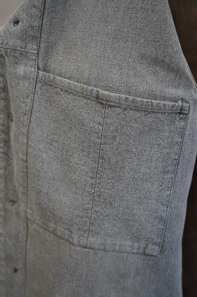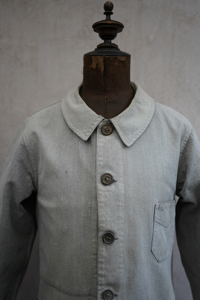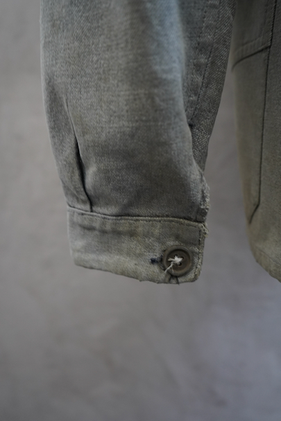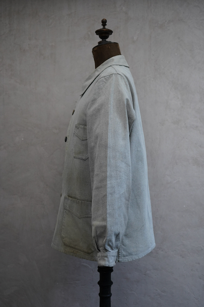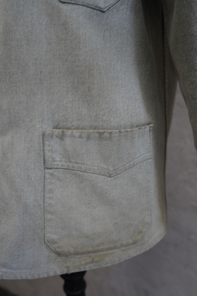 1930年代頃につくられたワーク・ジャケット。ブラック・シャンブレーが褪色してグレーになったコットン素材。フレンチワークらしいカーブした襟、厚みのあるウッド・ボタン、Vステッチの入ったポケット、良いディテールです。擦れや小さい穴、直し痕、薄いシミがありますが、生地感はまだしっかりとしています。