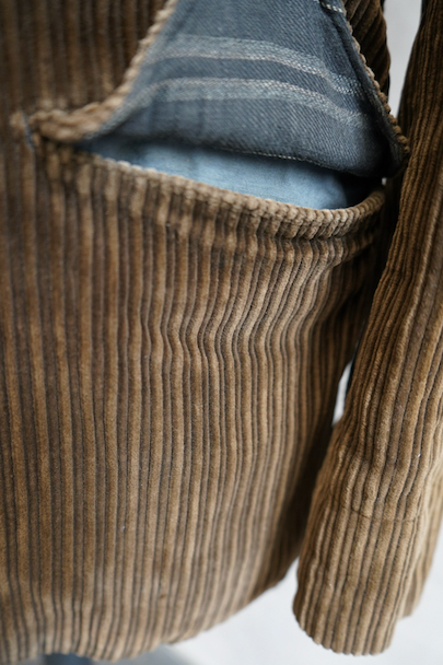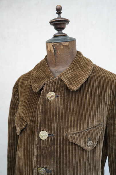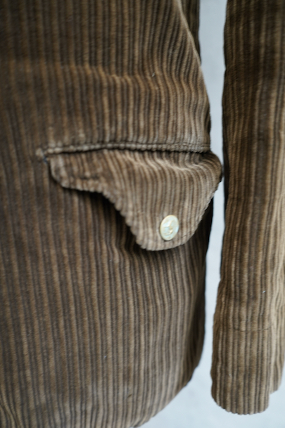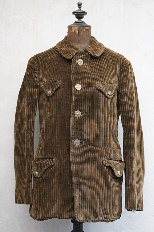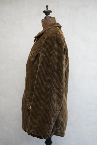 1920年代から1930年代頃までにつくられたブラウンのコーデュロイ・ジャケット。珍しい親子畝のコーデュロイ、畝が際立った布地の表情が良いです。ボタン留めの小さめのフラップ・ポケットが両胸に、下方の左右のポケットはフラップに飾りボタンがついています。動物柄のメタル製ボタンがついていますが、バックにハンティング用のゲームポケットはありません。ボタンホールは手縫い。 ストライプ柄コットンの裏地、内ポケット1つ。フロント一番下のボタンのみオリジナルからつけ替わっているようです。立ったダメージはなく、状態はとても良いです。とても綺麗なジャケットです。