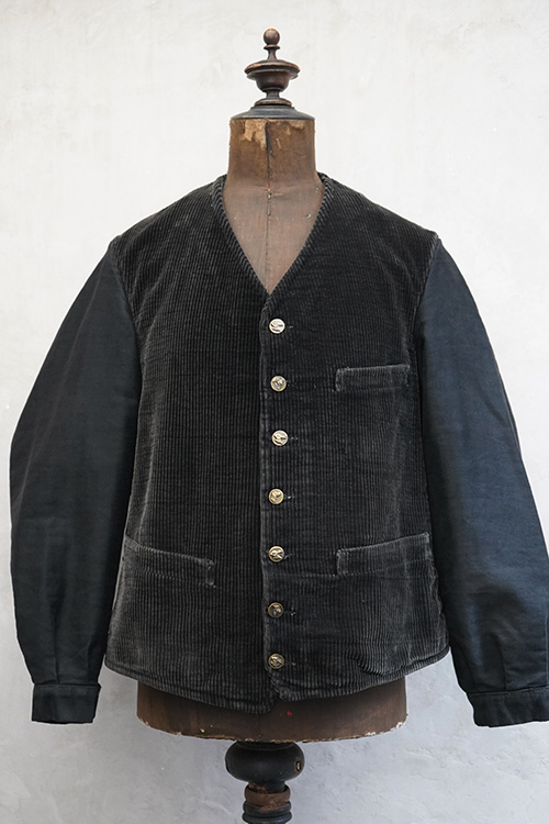 1940年代頃までにつくられた表身頃がダークブラウン・コーデュロイの袖付きジレ。袖と後ろ身頃はブラック・モールスキンです。"Le Meilleur d'Amiens"刺繍タグがついています。フロントに7つ並ぶ動物メタルボタンは、ウサギ、犬、馬柄の良いボタンです。フロントに3つのポケット、内ポケットが1つ。バックシンチで身幅の調節ができます。状態は良いです。