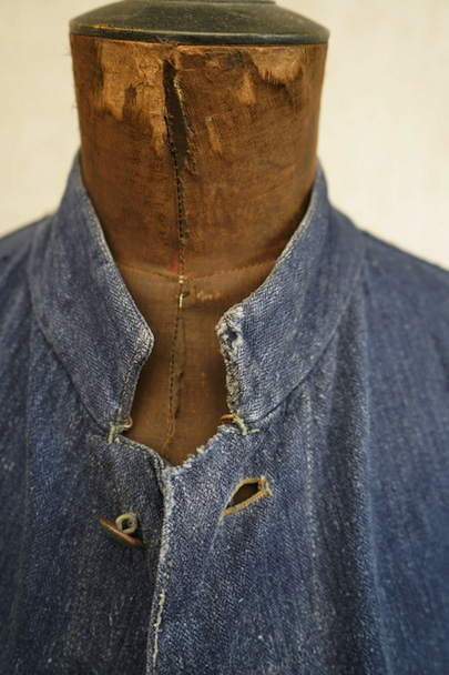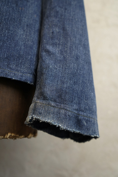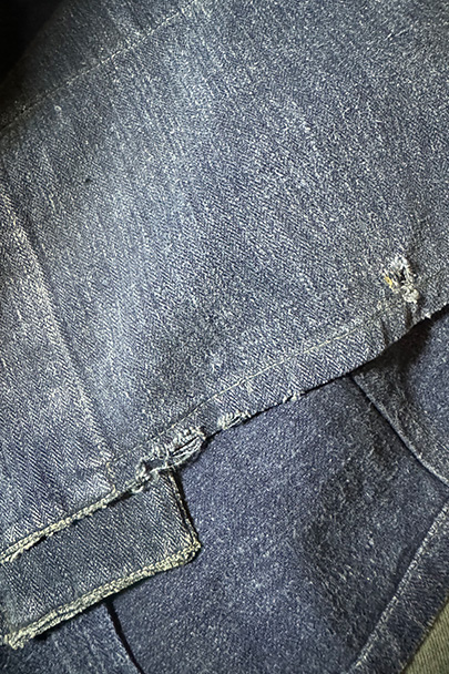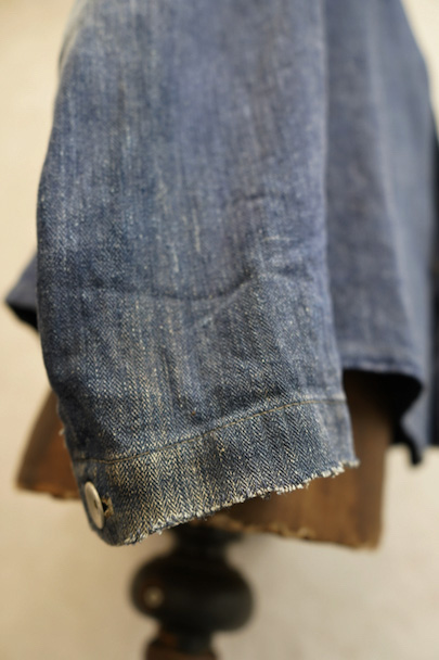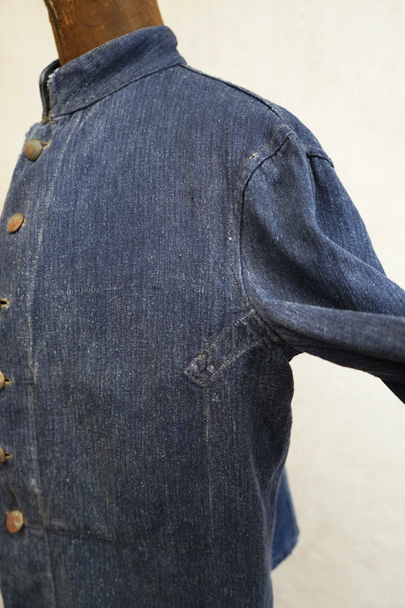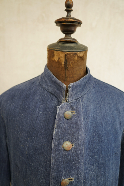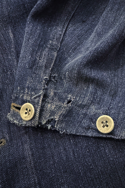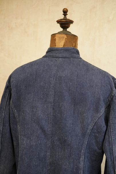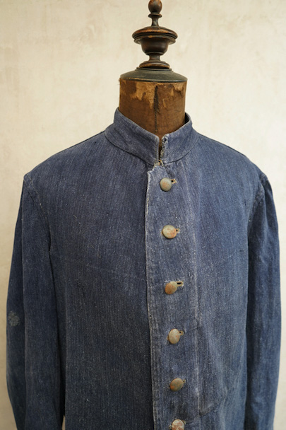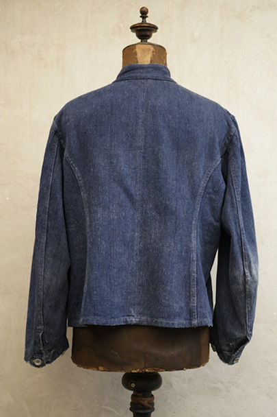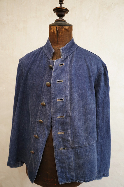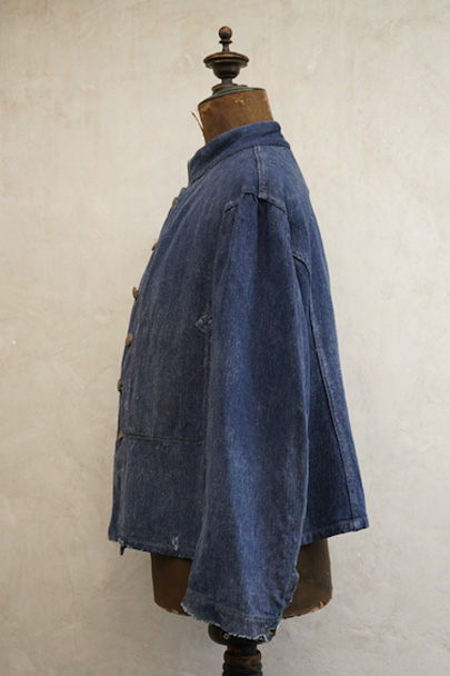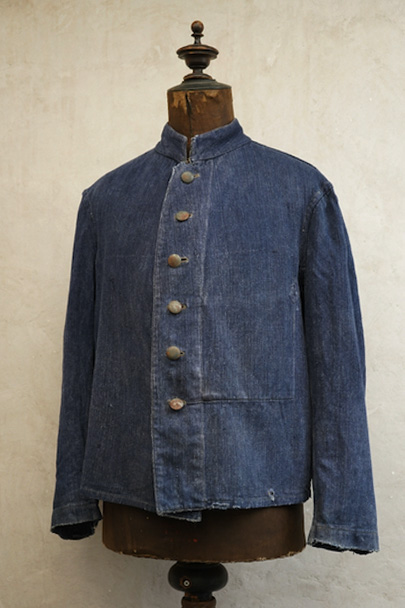 第一次大戦頃のドイツのスタンドカラーのジャケット。ヘリンボーン織りのリネン素材です。軍のスタンプ等はありません。短丈できれいな形です。鉄製のボタンに錆があります。内ポケットが1つ。右袖に3cmほどの直し痕、袖口や襟、裾に擦り切れや穴、全体的に擦れや傷などの経年のダメージがあります。