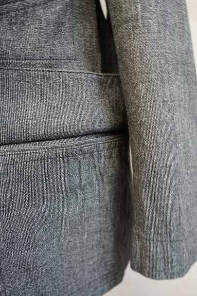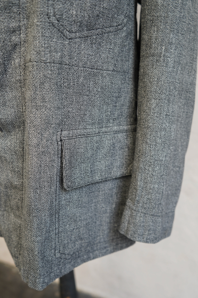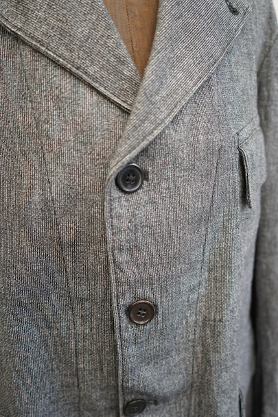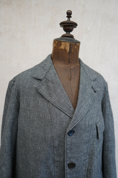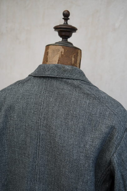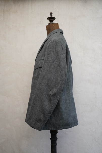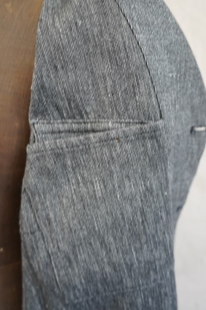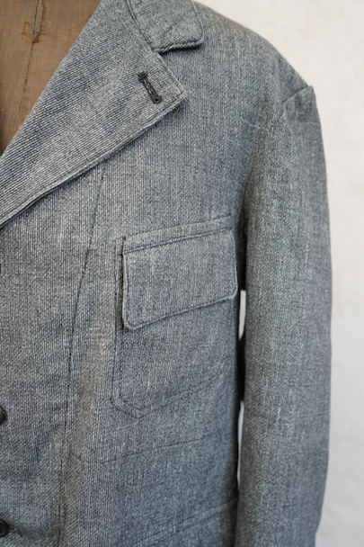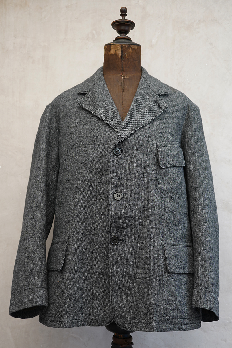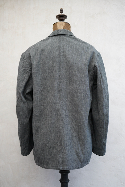 1930年代から1940年代頃につくられたストライプ織りのごま塩コットン素材のジャケット。柔らかさのある良い布地です。フロント3つボタン留め、3つのフラップ付きポケット、内ポケットが1つ。左胸のポケットはかなり傾斜がついています。襟裏には細かいステッチが入った良いつくりです。未使用品のように使用感はほとんどなく状態はとても良いです。