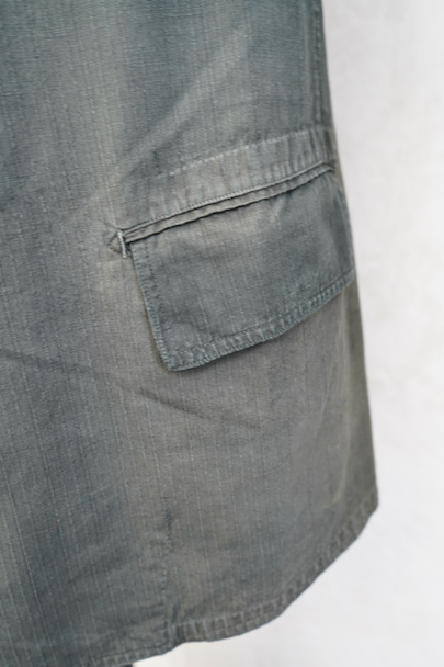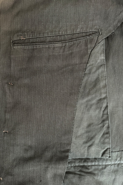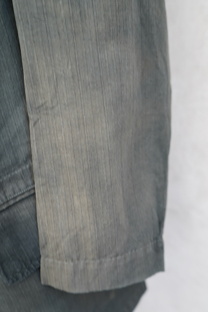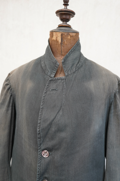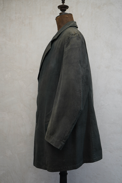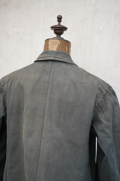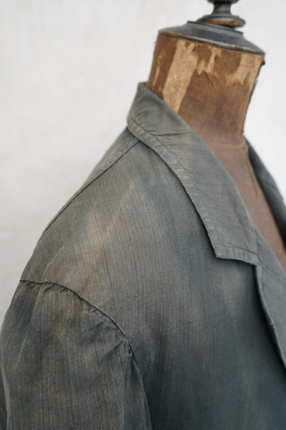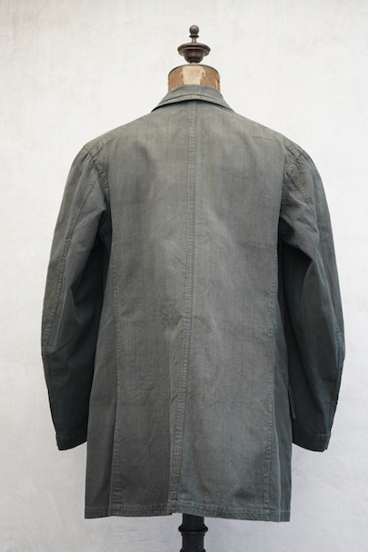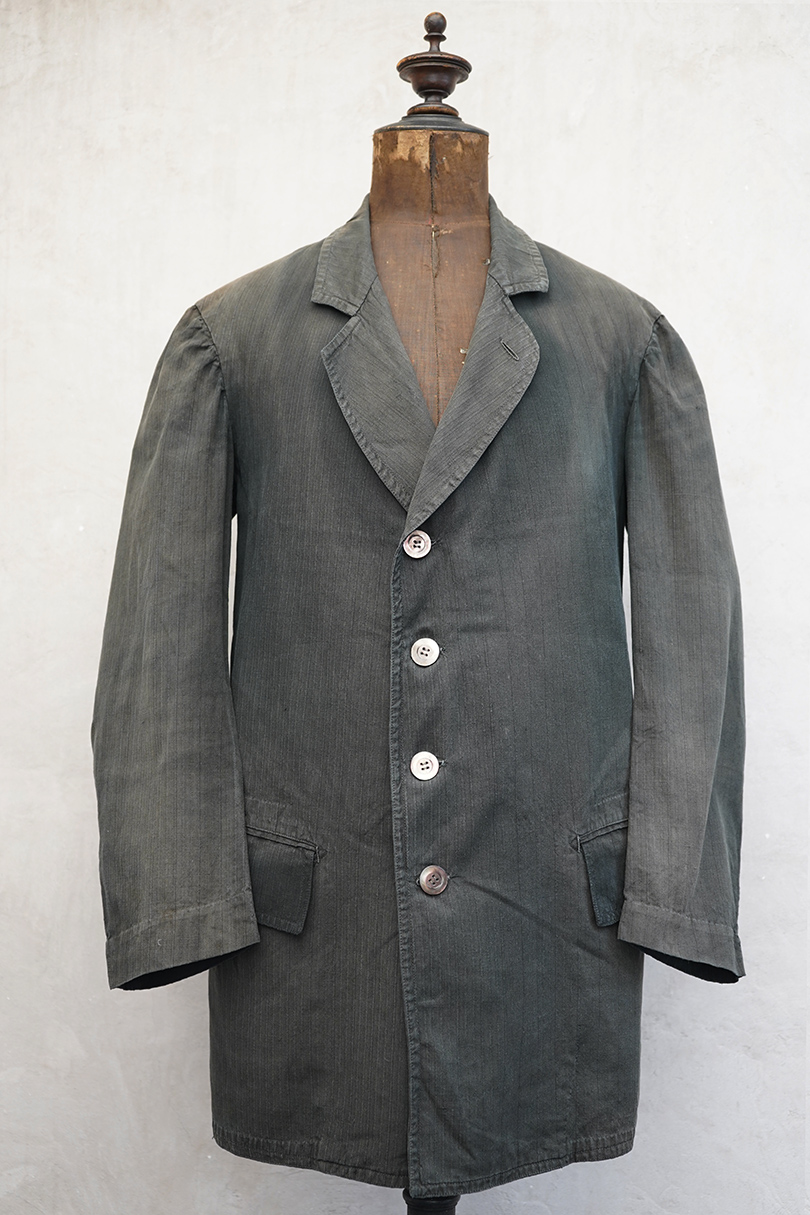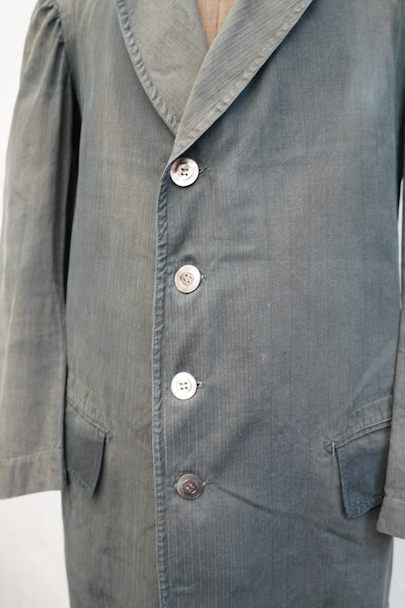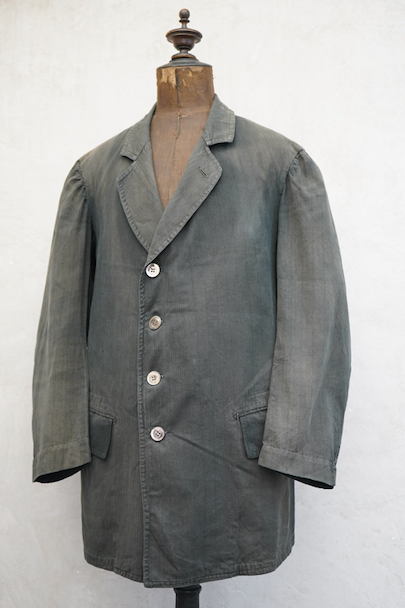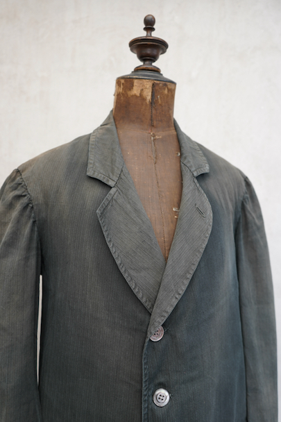 1930年代頃までにつくられた4つボタン留めのジャケット。ストライプ織り柄の入った少しシャリ感のある涼しげなリネン・コットン素材、黒(ダークグレー?)に後染めされて、その後色褪せしています。大きな黒蝶貝のボタンがついています。ボタンホールは手縫い。フラップ付きのポケット、内ポケットも2つあります。左肩に小さな穴、全体的に色むらがあります。