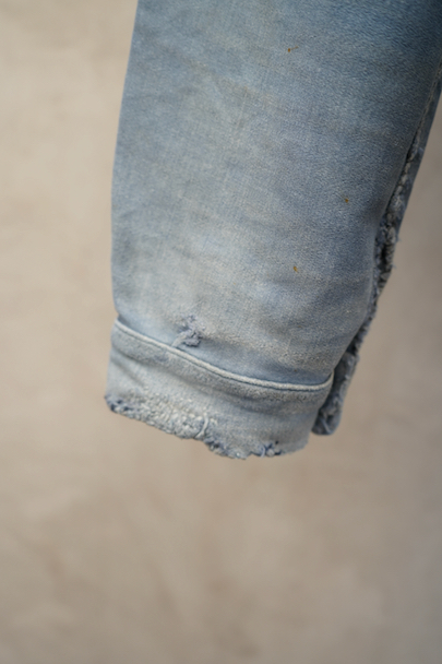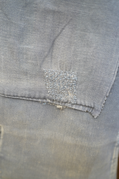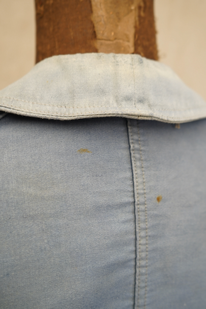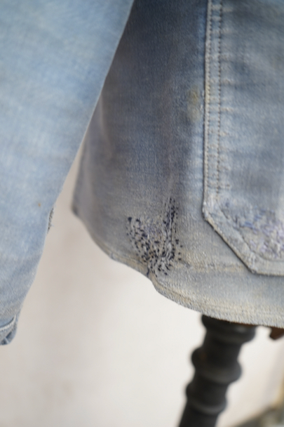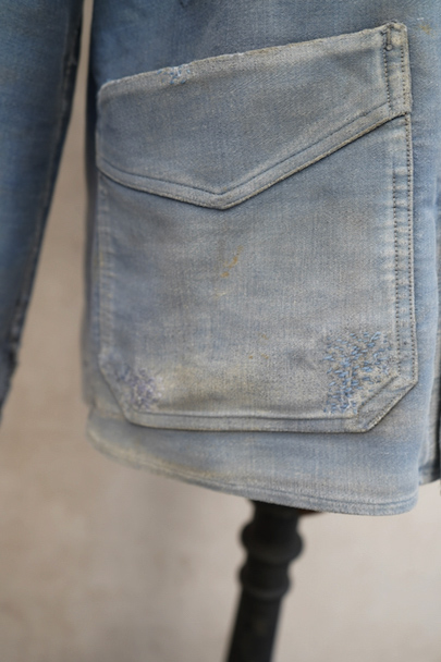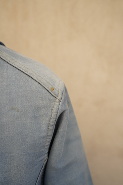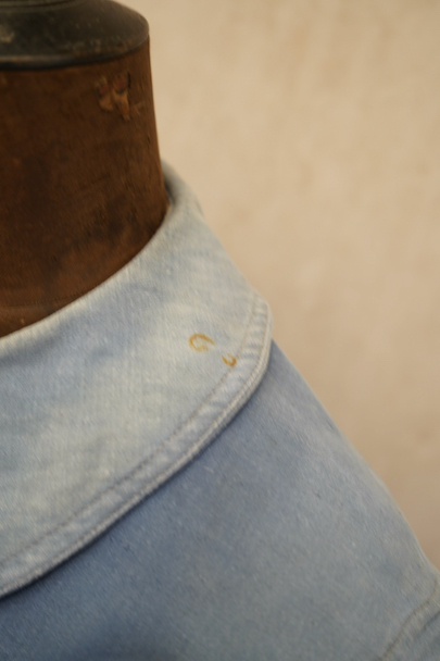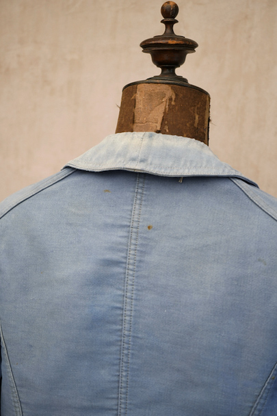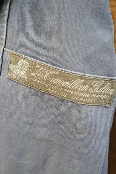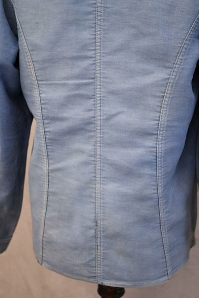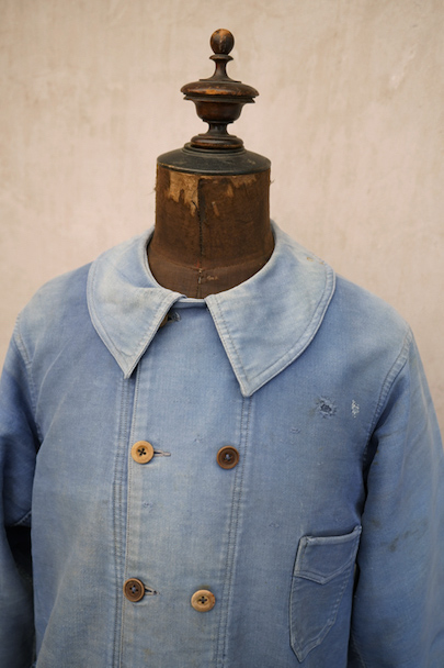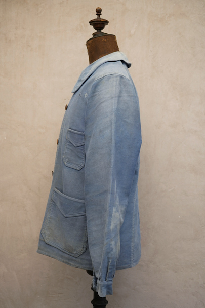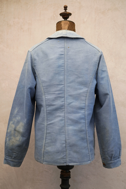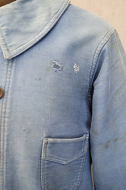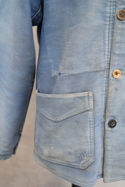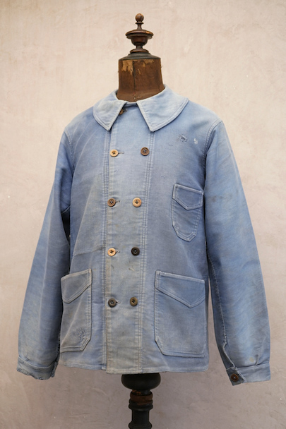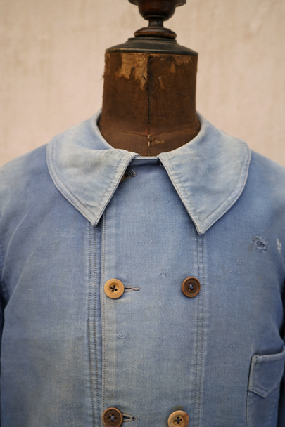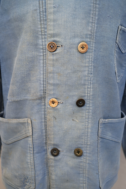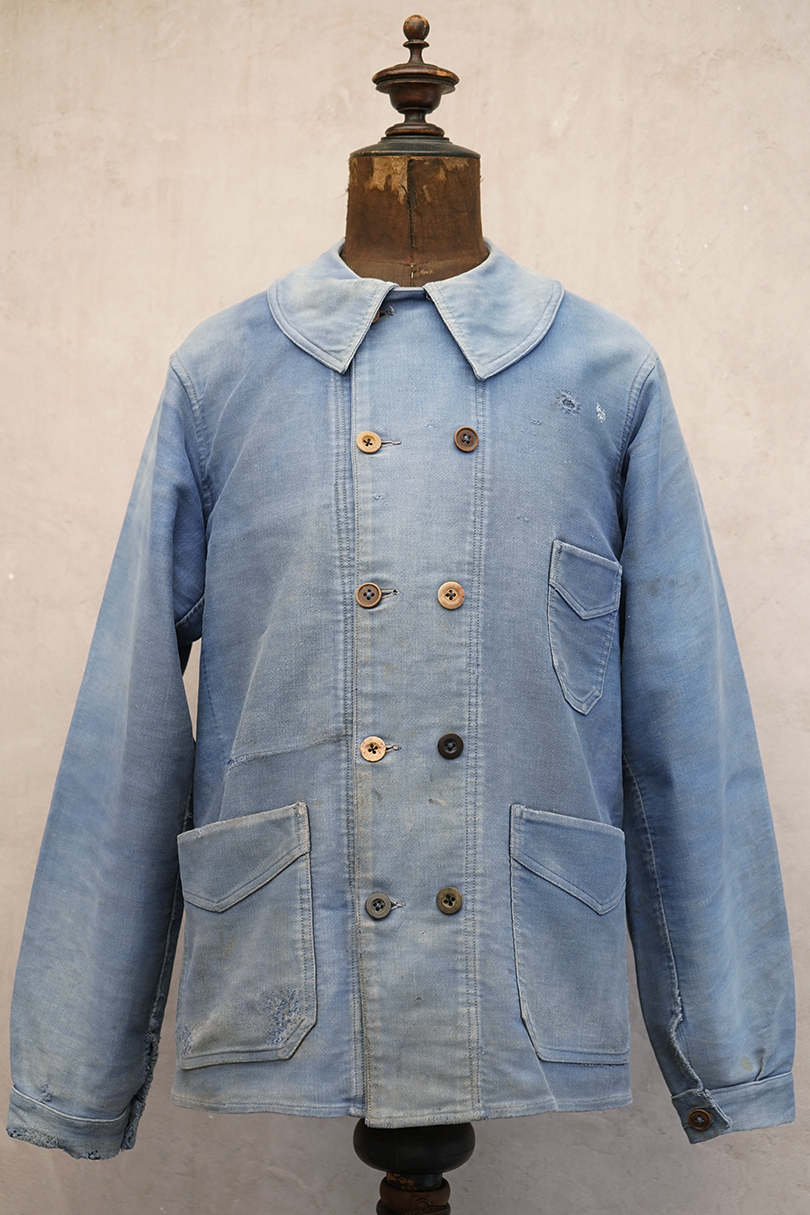 1930年代から1940年代頃につくられたブルー・モールスキンのダブルブレスト・ワークジャケット。大きく平たい丸くカーブした襟、Vポケット、胸に小さなポケット。後ろに下がった肩のラインやフロントから後ろ身頃までアーチ状に回り込んだカッティング、綺麗な形のジャケットです。"Le Travailleur Gallice"の味わいのある刺繍タグがついています。使い込まれて褪色し、所々修繕され、ボタンは様々なものにつけ替わっています。全体的に擦れや小穴、シミ、ほつれなどの経年の傷みがあります。
