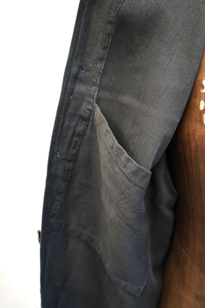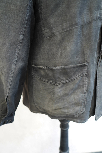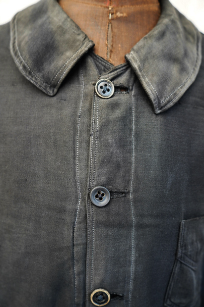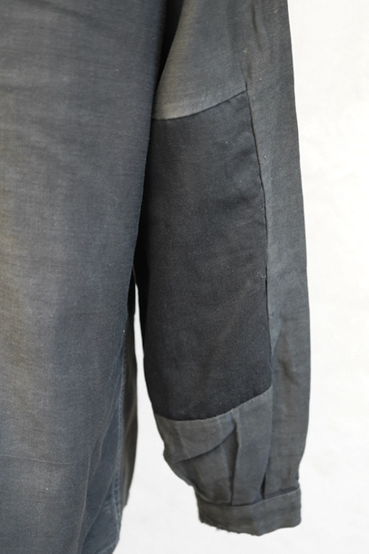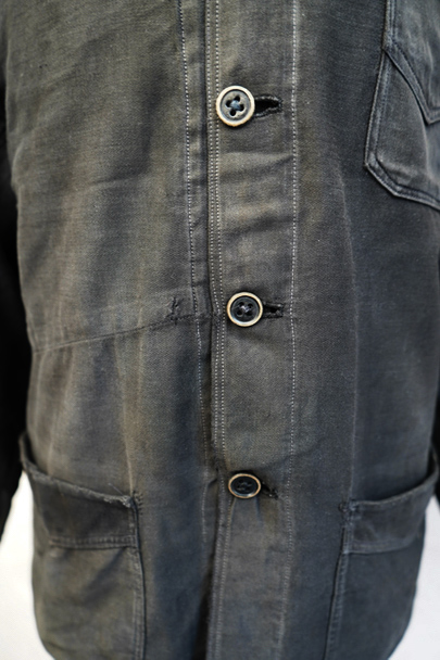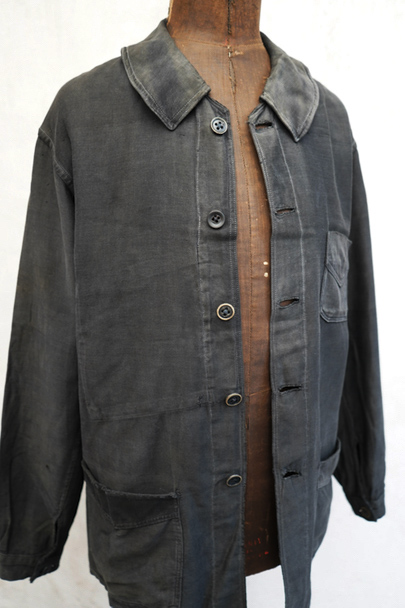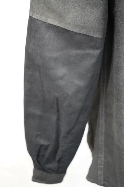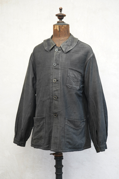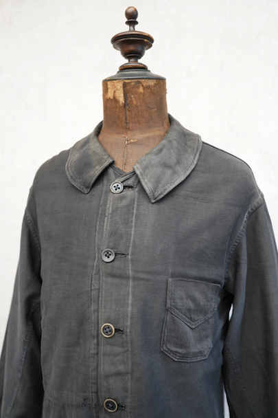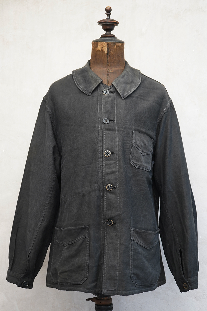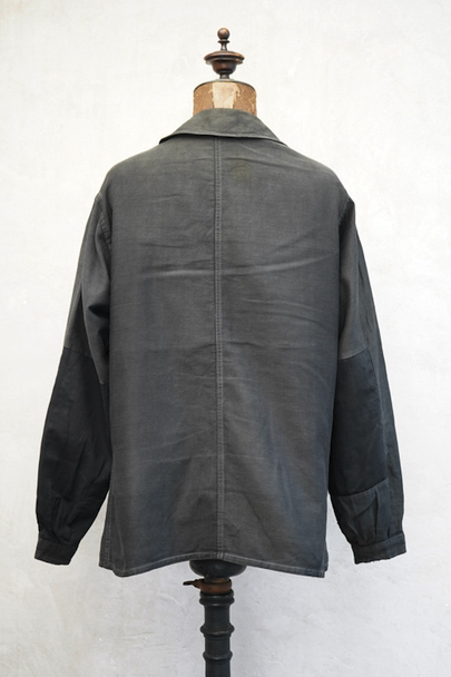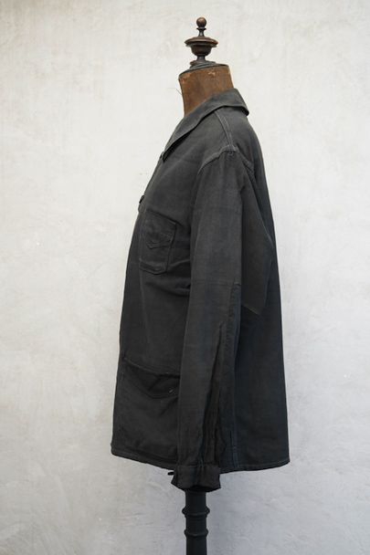 古いものは大変希少なブラック・コットン・ツイルのワークジャケット。1910年代から1920年代頃につくられたものだと思います。縫い留められたフレンチワークらしい丸くカーブした平たい襟、Vポケット、パピエマシェのボタン、手縫いのボタンホール。両袖は布を接いだ修繕がされています。袖口に擦り切れの修繕、ポケット周りなど全体的に擦れ、小穴、直し痕があるなど経年劣化はありますが、着用に問題ないコンディションです。ボタンは一部つけ替わっています。