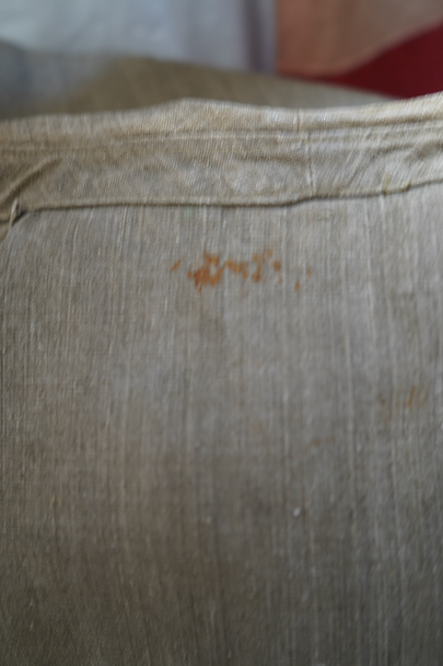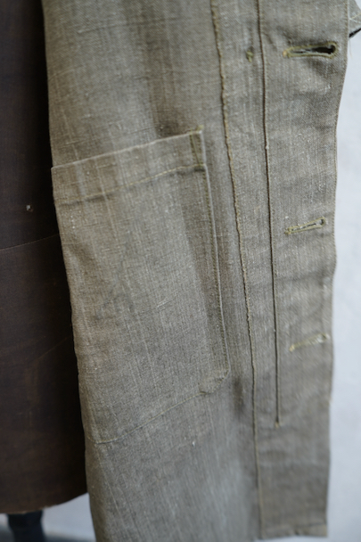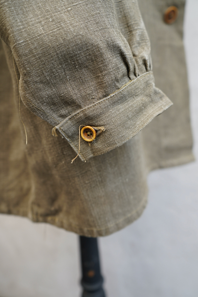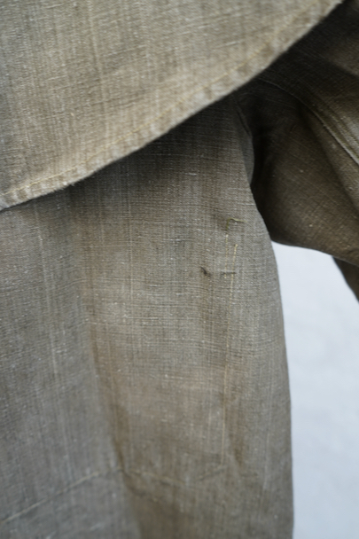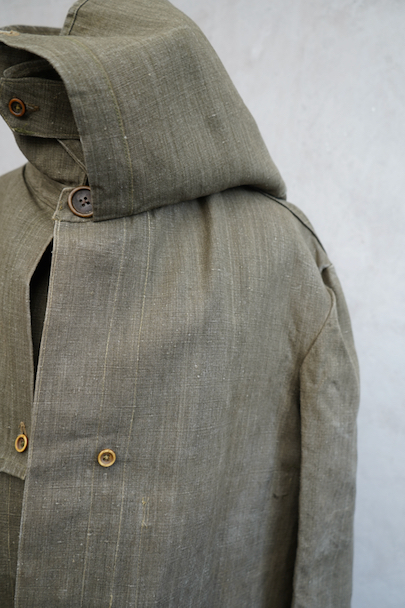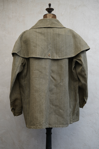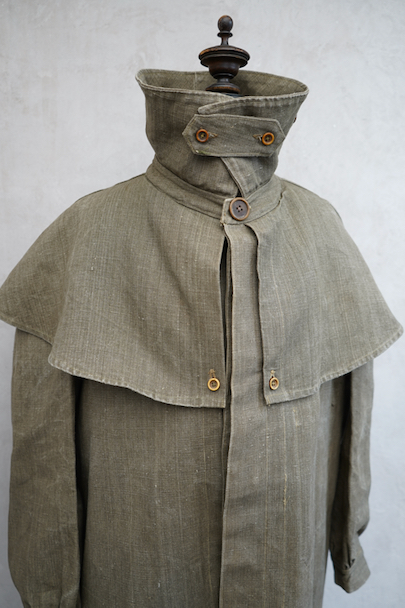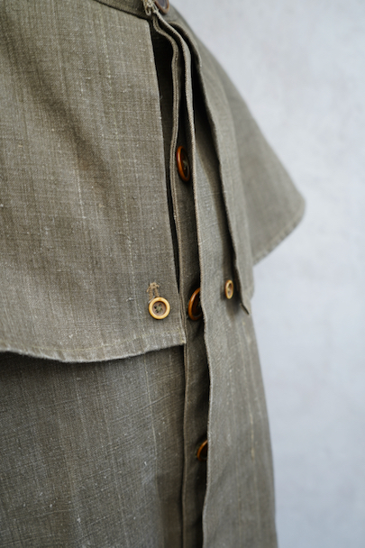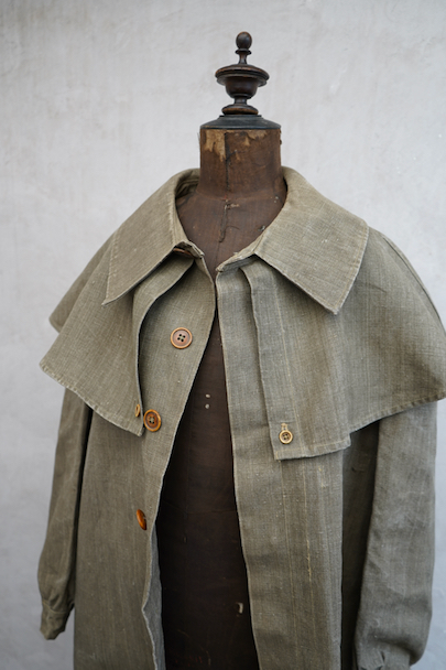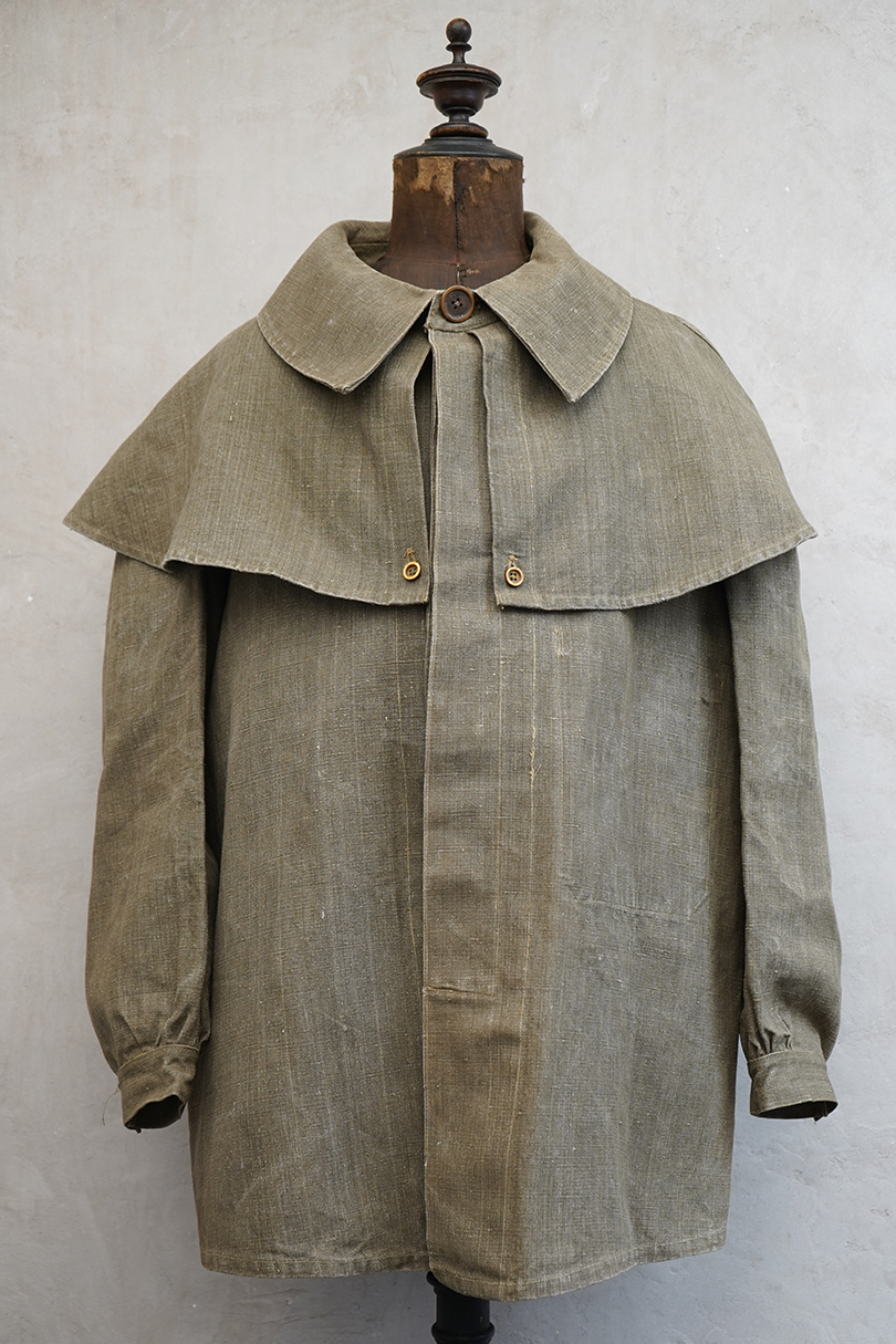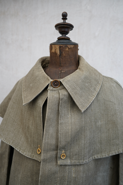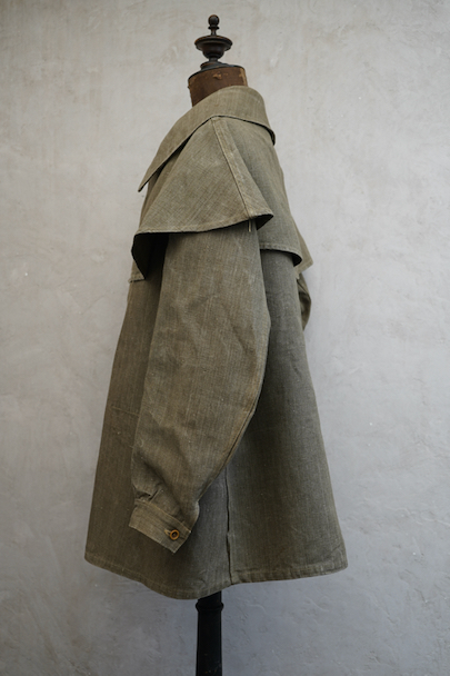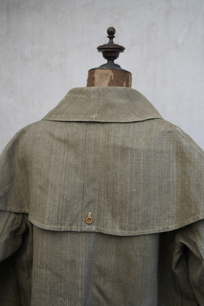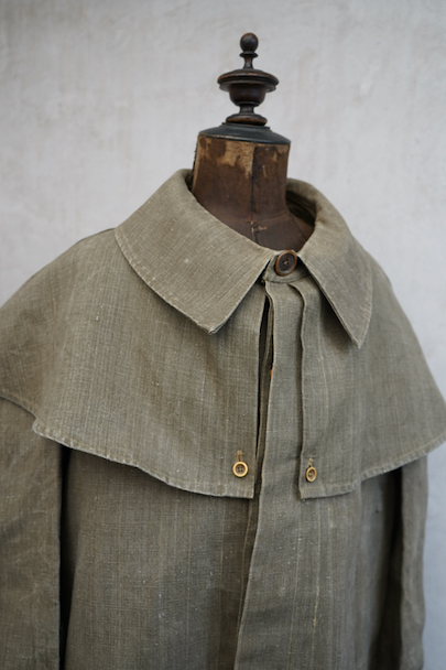 珍しいカーキ・リネンのケープ・ジャケット。1930年代から1940年代頃のものだと思います。しっかりとしたリネン地、使用感はほとんどありません。大きく丸みのある襟にはチン・ストラップ、ケープは裾がボタン留めになっています。ケープの取り外しはできません。フロントは比翼仕立て。表にはポケットがなく、内ポケットがついています。若干の擦れ、内側にシミがありますが、大きなダメージはなく状態は良いです。