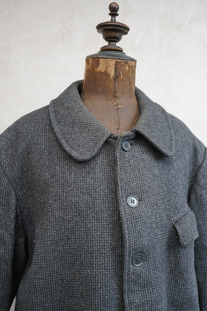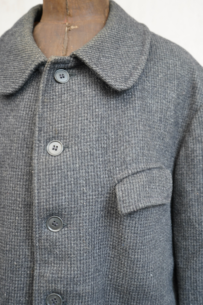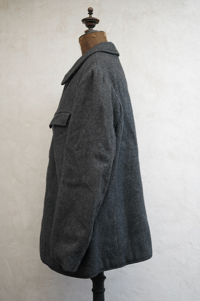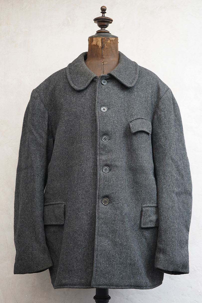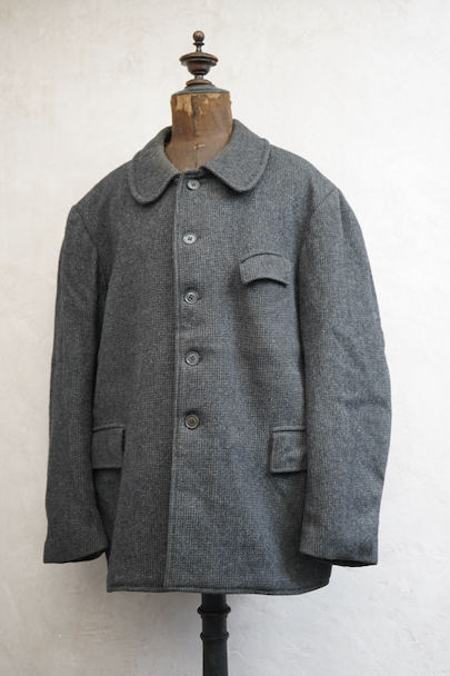 20世紀中期頃につくられた頃につくられたウール・ワークジャケット。フロントはグレーのウール素材、Pascalのもので裏地付きです。フロントに3つのフラップ付きセットインポケット、内ポケットが2つ。裏地に穴や直し痕があります。表地は擦れなどは見られますが、大きなダメージはなく状態は良好です。