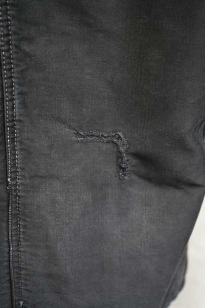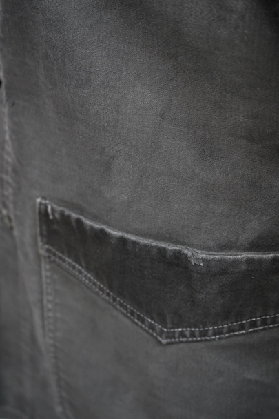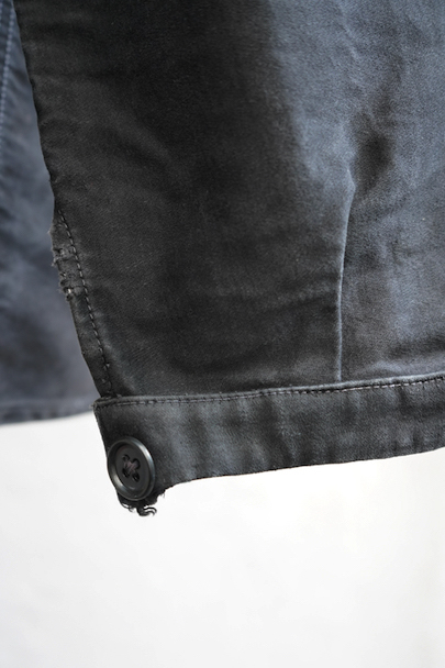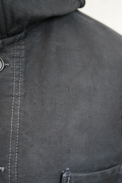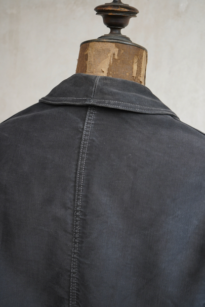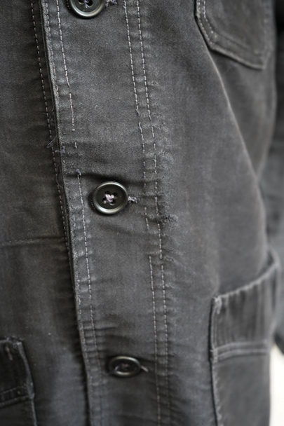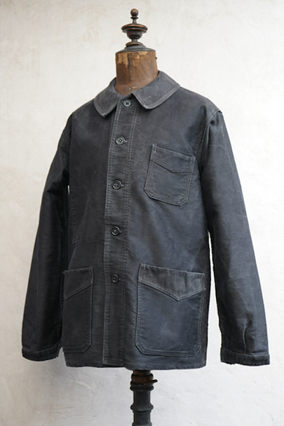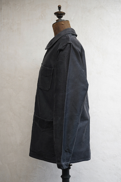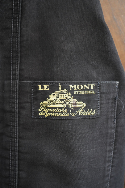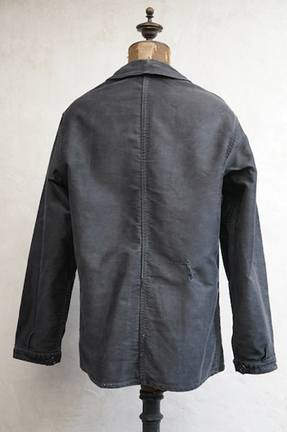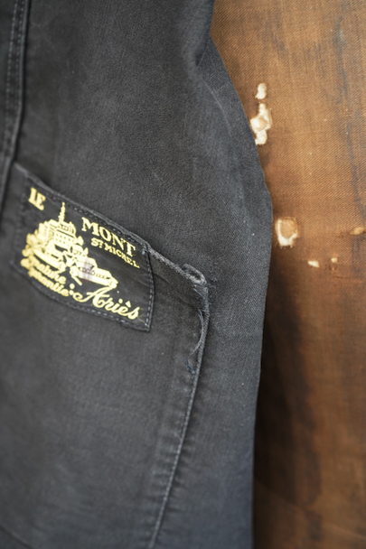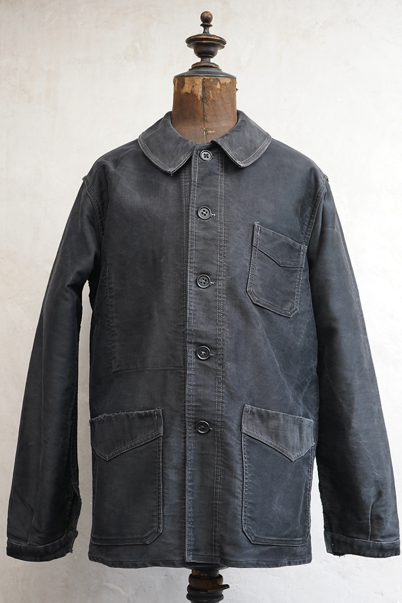 1940年代頃につくられたブラック・モールスキン・ワークジャケット。"Le Mont St Michel"製、刺繍タグがついています。フレンチワークらしい丸くカーブした襟、Vポケット、白抜けしたステッチ。袖口に織り込んだ直し、ポケットの口に擦り切れ、バックに4.5cmのL字の直し痕があります。色褪せや傷、小穴、ほつれがあるなどの使用感があります。