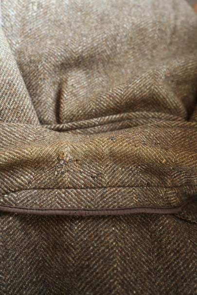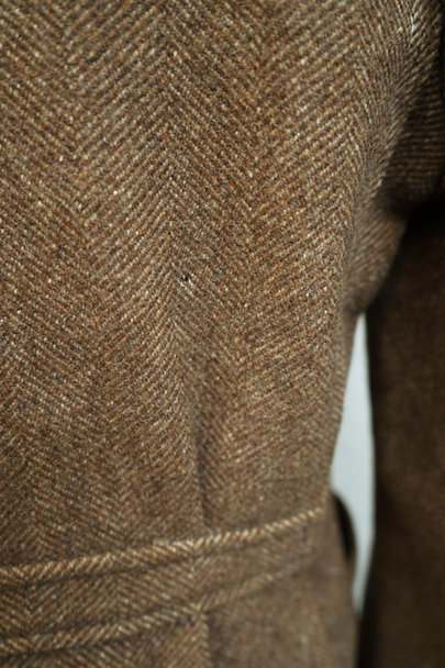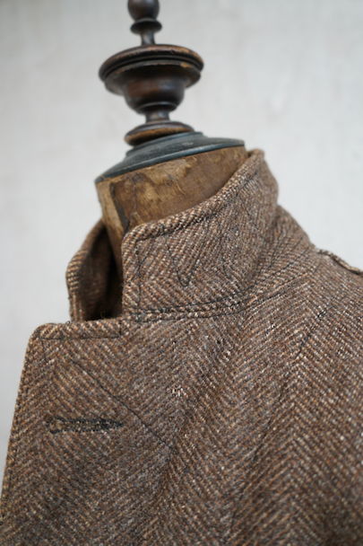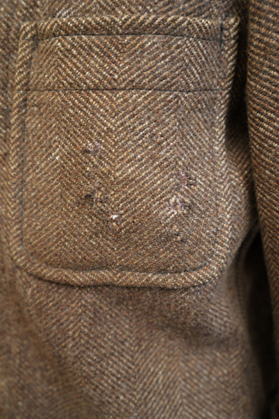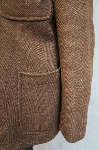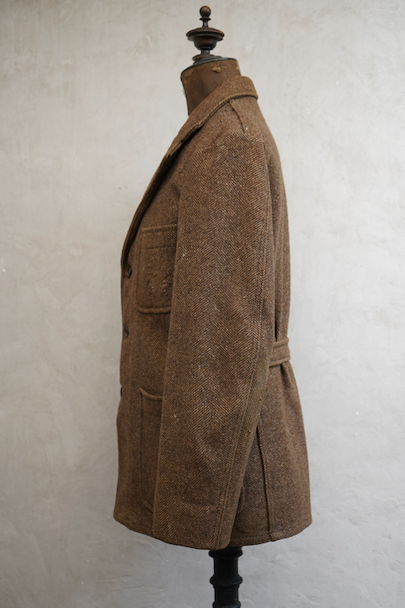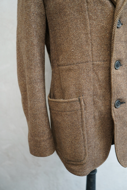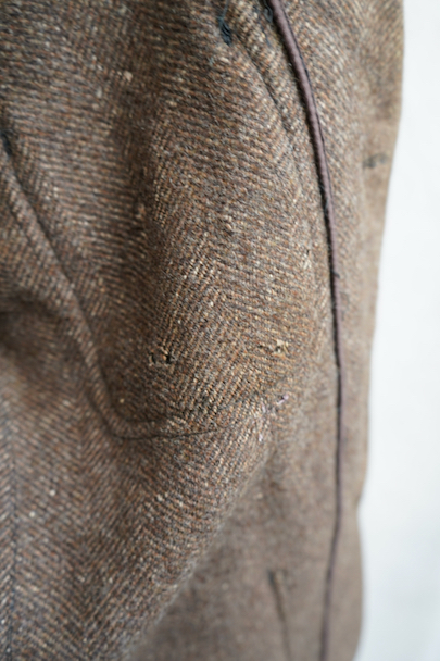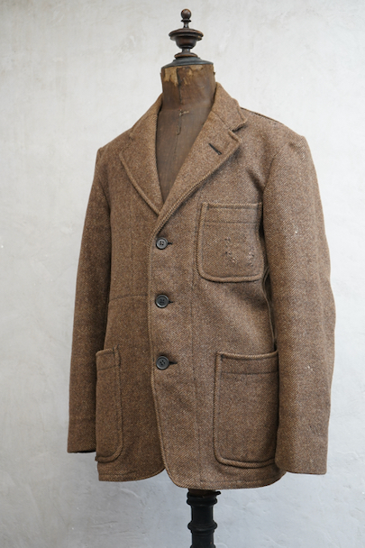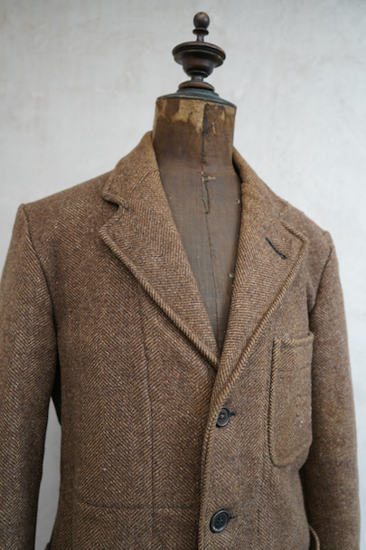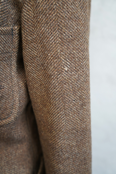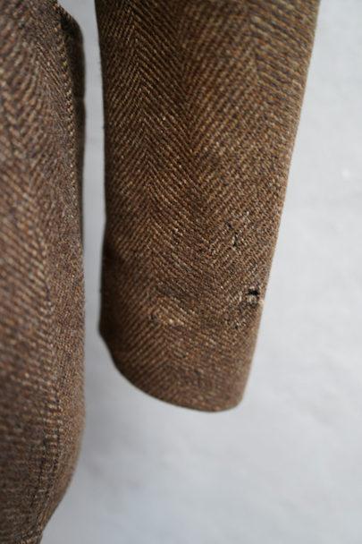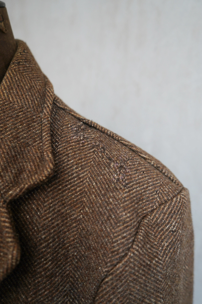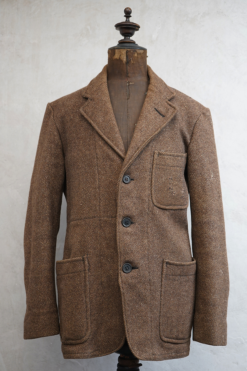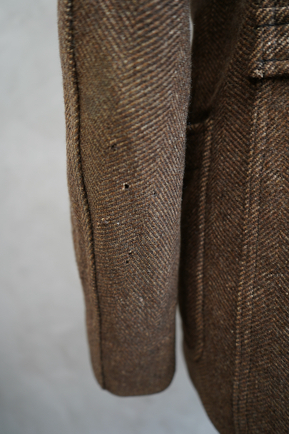 1940年代頃までにつくられたヘリンボーン織りごま塩ブラウンのウール・ジャケット。比較的厚みのある布地で、裏地はないですが、しっかりとしたつくりです。襟裏にはステッチ。ラペルドでバックにマルタンガル、フロントに3つのパッチ・ポケット、内ポケットが1つ。全体的に穴や直し痕が多くあります。フロントのボタンは一番上がつけ変わっているようですが、全てウッド製です。ダメージを気にされない方にお勧めします。