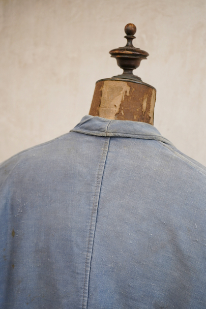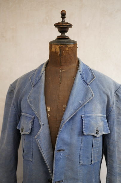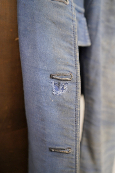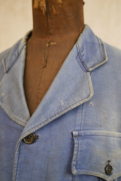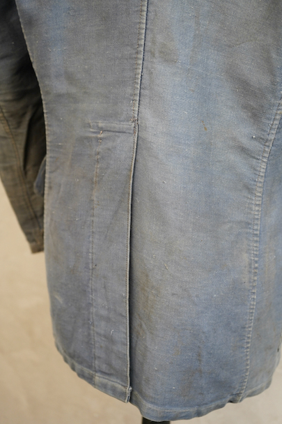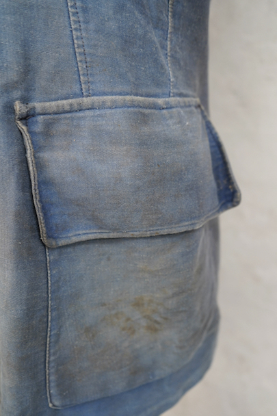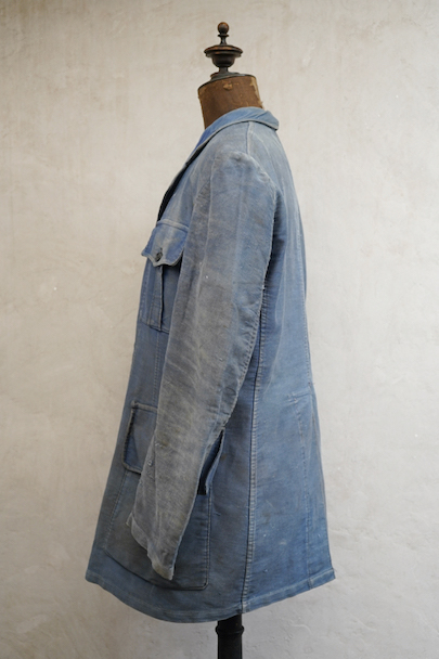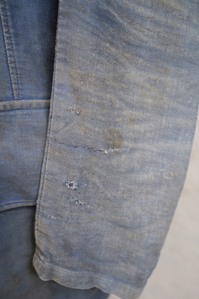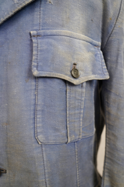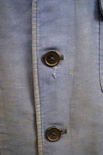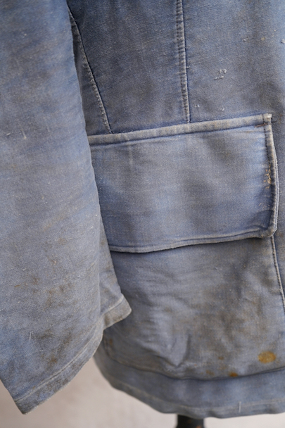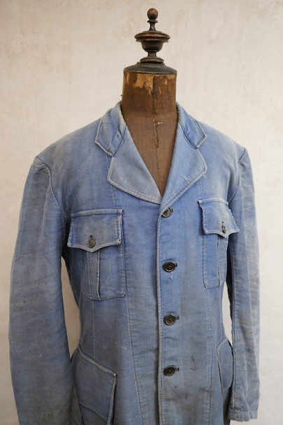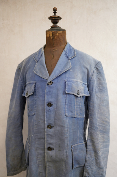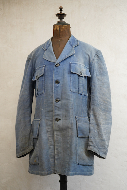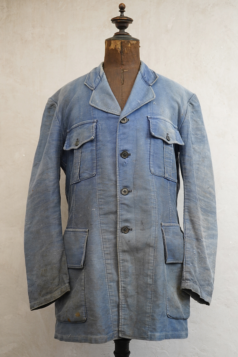 1940年代頃までにつくられたブルー・モールスキン・ジャケット。ラペルド・タイプ、両胸のポケットはプリーツが入ったボタン留め、フロントに4つのポケットが配され、バックはセンタベント。下方のポケットは大きなフラップがついています。袖に穴や擦れが多く、全体的に擦れや傷、穴、ほつれ、シミがある等、使用感があります。ボタンにひび割れが見られます。襟章がついていた痕があるので、ファイヤーマンか何かのユニフォームだったようです。