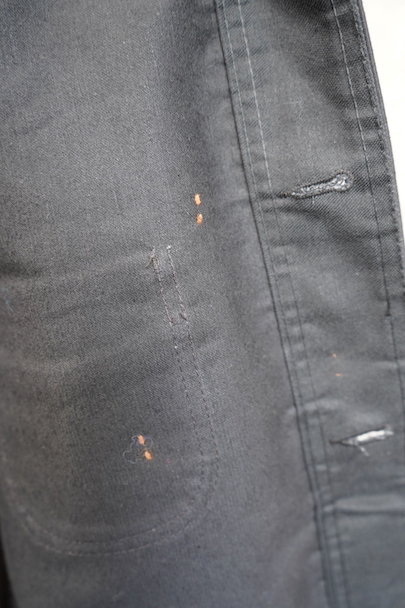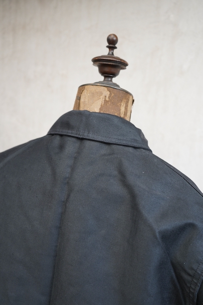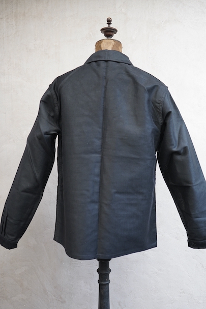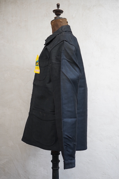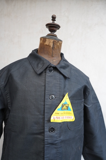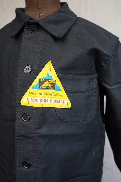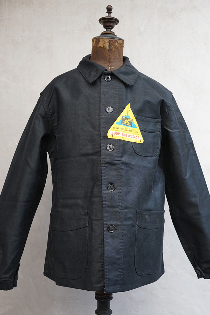 1950年代から1960年代頃のブラック・モールスキン・ワークジャケット。"Le Mont St Michel"製、プリントタグ、紙タグ付きのデッドストックです。表記サイズは48です。フラッシャーを留めているハリが錆びていて、そのサビ染みがついています。初めて水通しする際に多少縮む可能性があります。