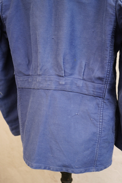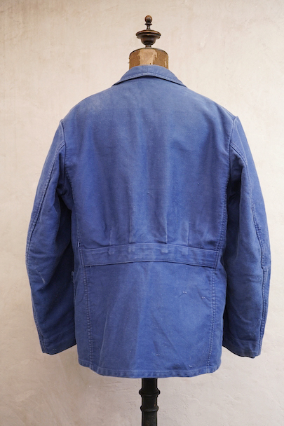 1940年代頃につくられたラペルド・タイプのブルー・モールスキン・ワークジャケット。リヨンのワークウエア老舗"Adolphe LAfont"製、古い刺繍タグがついています。肉厚で柔らかさのある布地が使われ、フロントは3つボタン留め、3つのパッチ・ポケット、バックにマルタンガルのついた綺麗な形のジャケットです。多少のシミや擦れ、傷がある等の使用感はありますが、大きなダメージはなく状態は良好です。