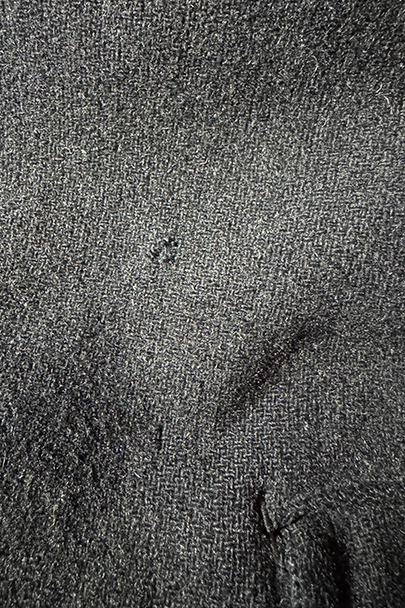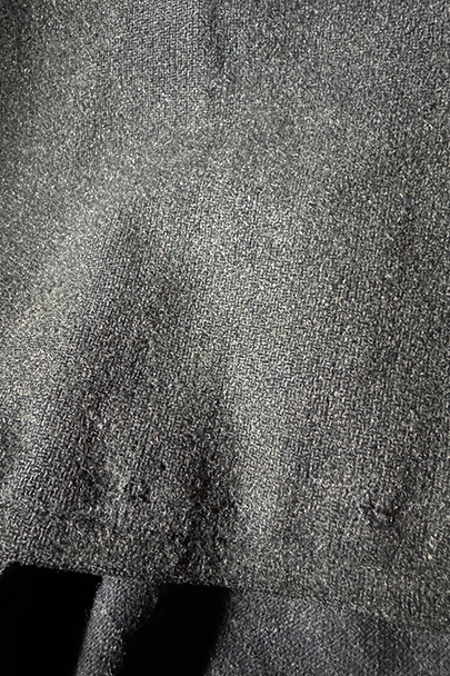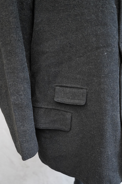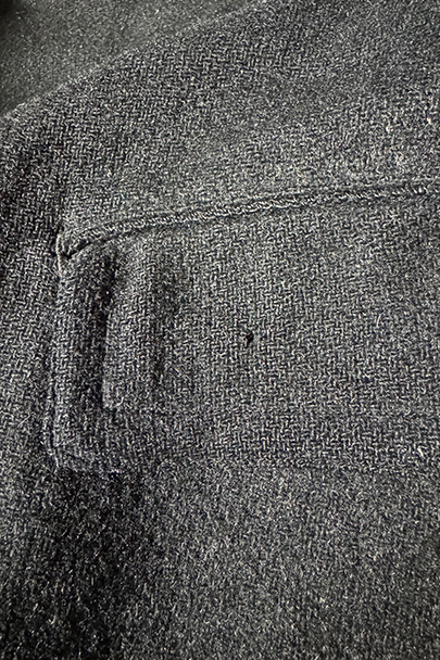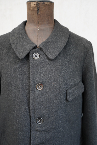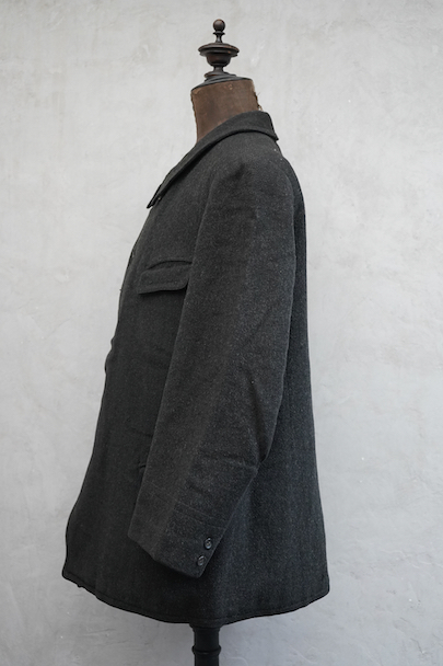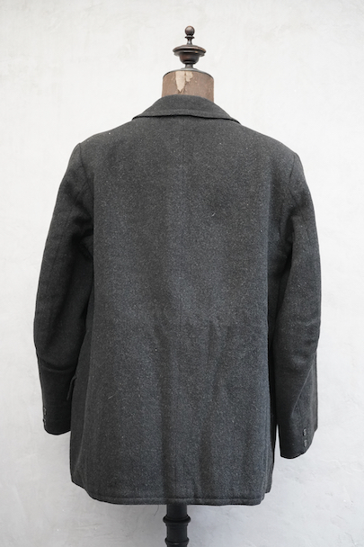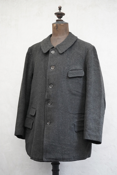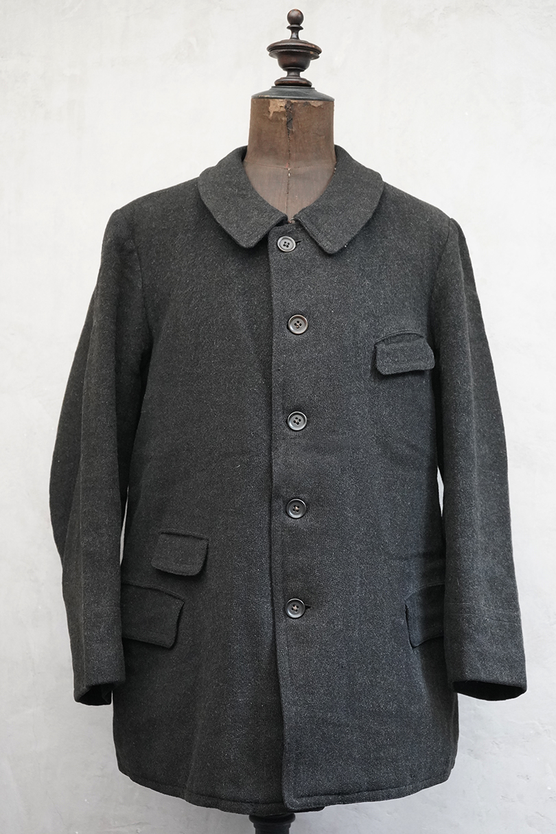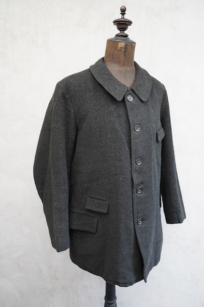 1930年代頃までにつくられたウール・ジャケット。”Samaritaine"のもの。フロントにチェンジ・ポケットを含め4つのフラップポケットがつきます(フラップはポケット内に収容可能です)。フレンチらしい丸くカーブした襟は裏にステッチ入り。裏地にはストライプのウール素材が使われ、装飾のきれいなスナップ・ボタン留めの内ポケットが2つついています。両脇に擦れがあり、左の脇の下部分に直し痕があります。裏地のアームホール部分に直し痕があります。その他、小穴、小さい直し痕、擦れがあるなどの経年の傷みがあります。