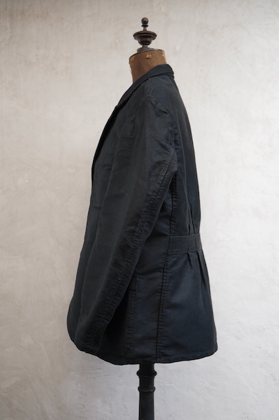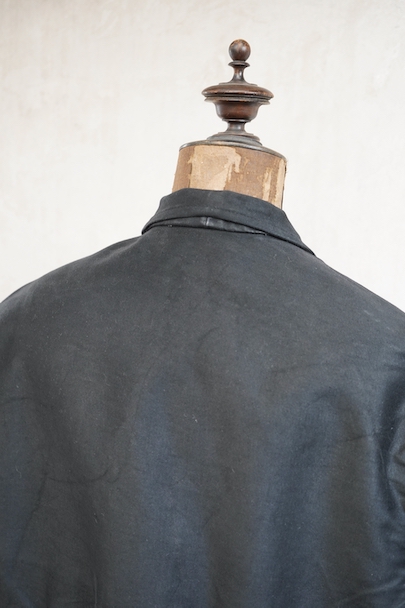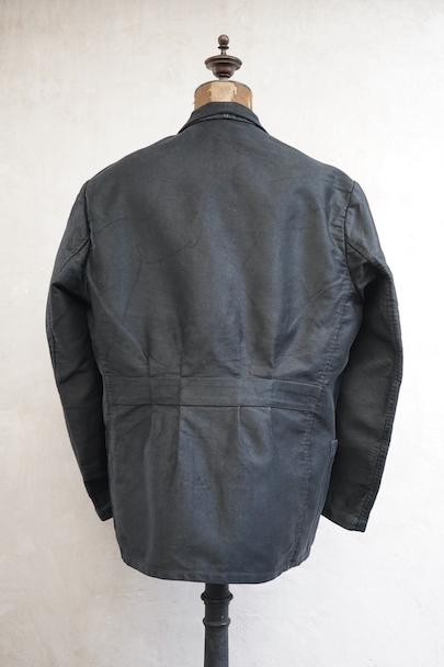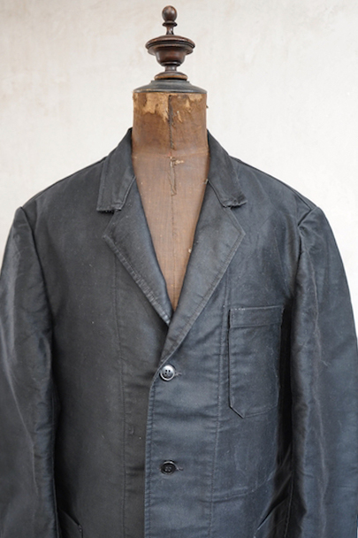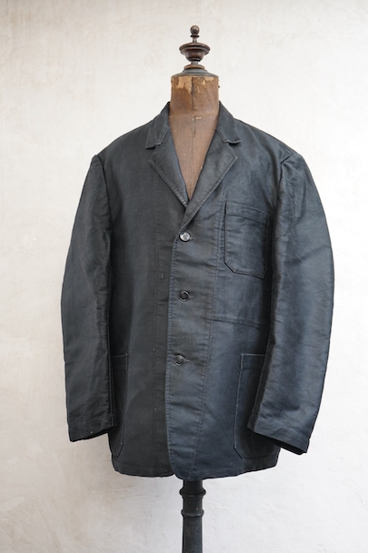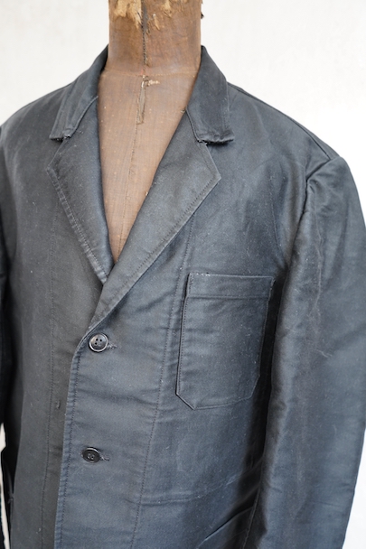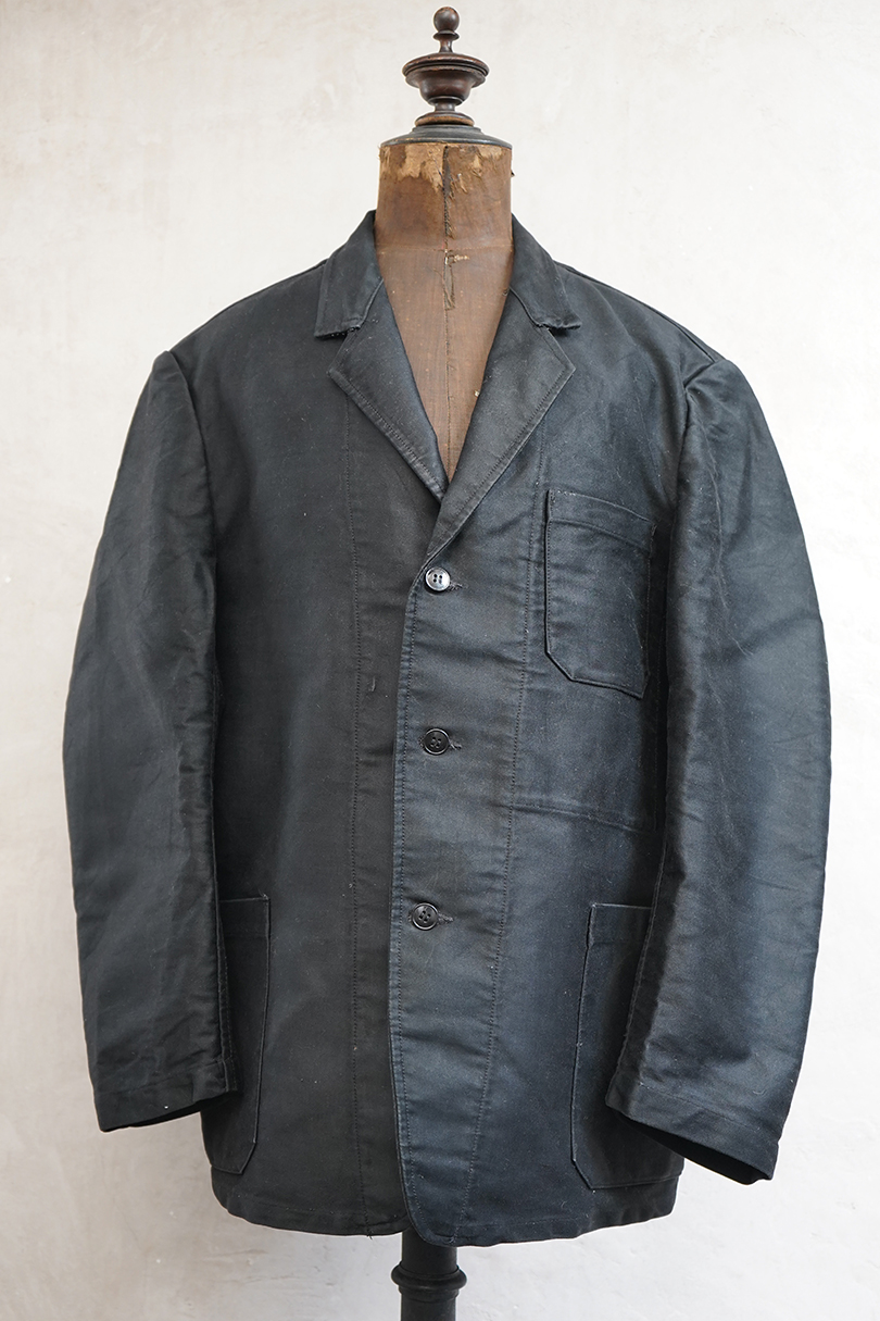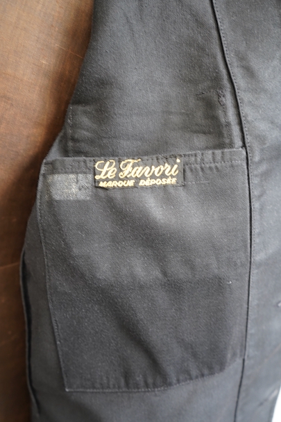 1950年代頃につくられたラペルド・タイプのブラック・モールスキンのワークジャケット。"Le Favori"の刺繍タグがついています。光沢のある中厚手のコットン地、使用感は少ないです。フロントに3つのパッチポケット、バックにマルタンガル。内ポケットが1つ。バックの下方などに多少の擦れがあり、内ポケットにシールを外した痕があります。状態は良いです。