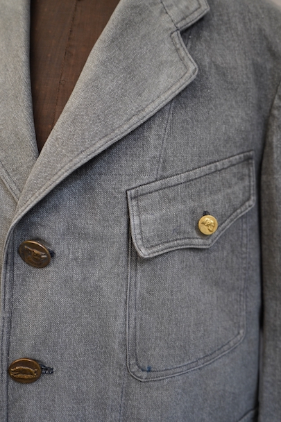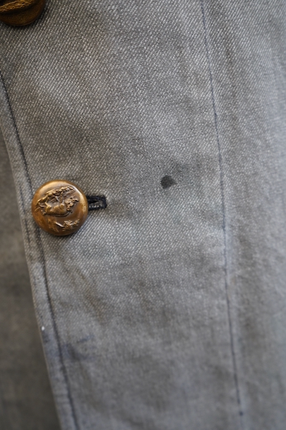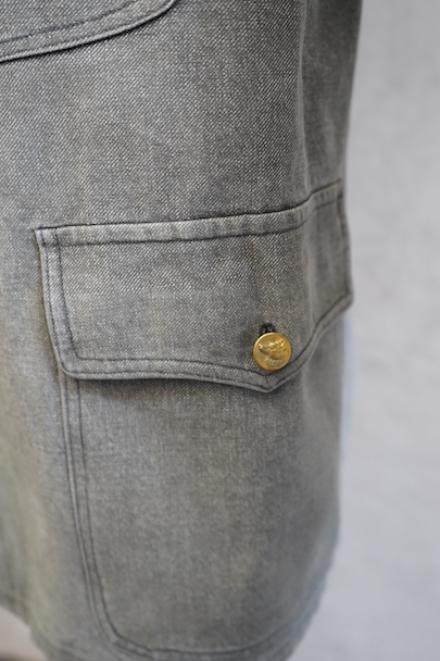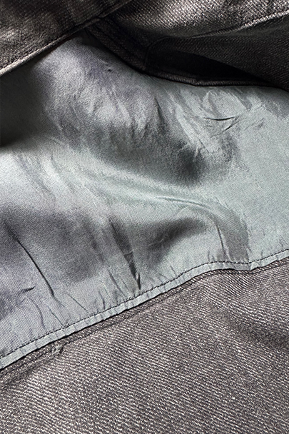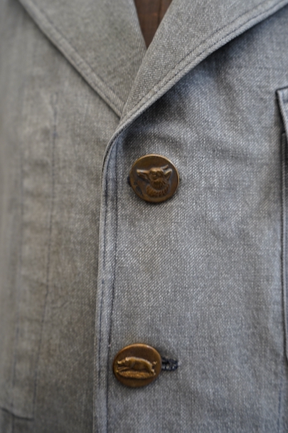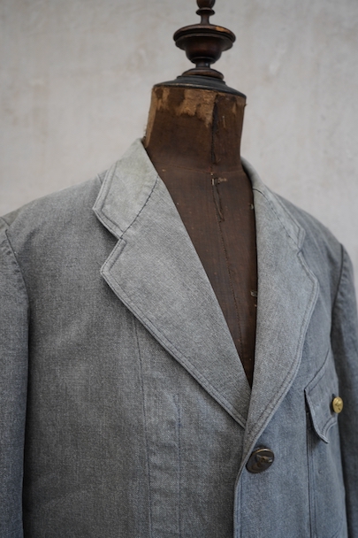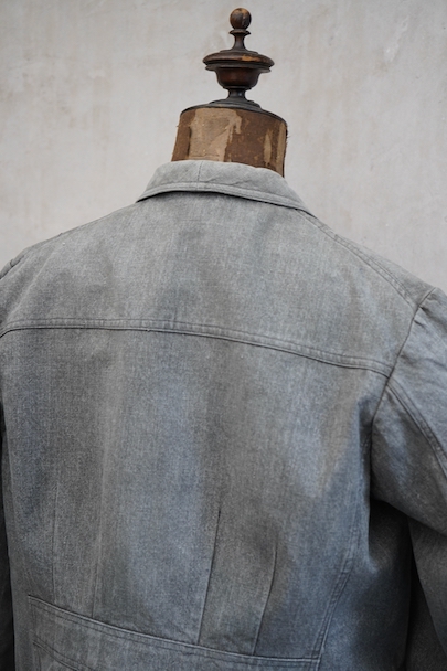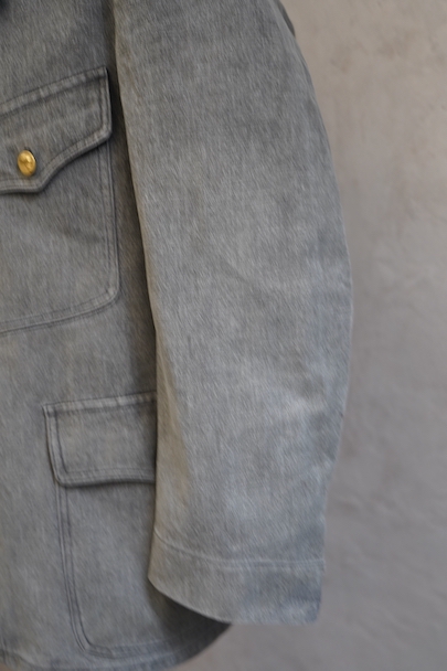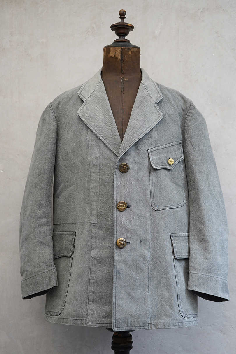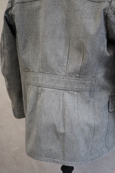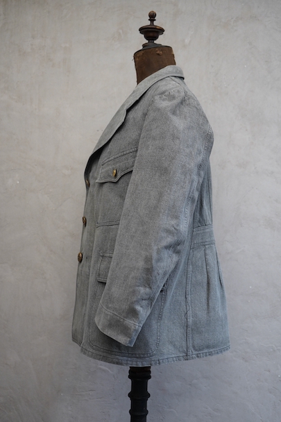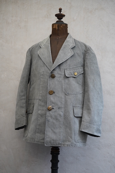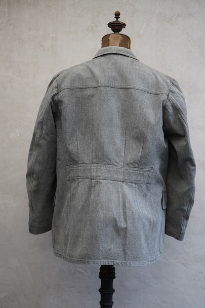 やや肉厚のブラック・シャンブレーの布地でつくられたラペルド・タイプのジャケット。フロントにボタン留めフラップ・ポケットが3つ、特に胸のポケットは傾斜がついて味わいがあります。ボタンはハンティング特有の動物柄のメタルボタンが使われています。1940年代頃につくられたものだと思います。バックにはマルタンガルがつき、横や後ろの姿が綺麗です。小さなシミや多少の擦れなどはありますが、大きなダメージはなく状態は良好です。バックのヨーク内側には防水のためだったのでしょう、化繊のような裏地がついていますし、 襟裏には細かいステッチが入った良いつくりです。