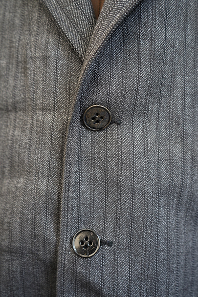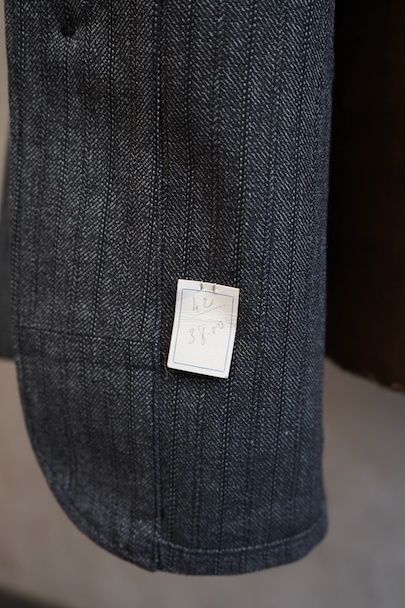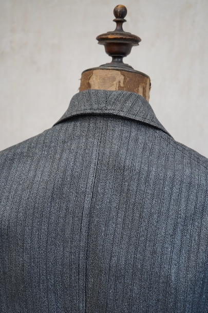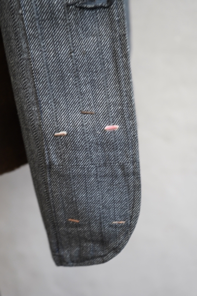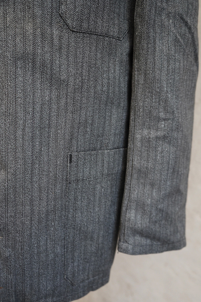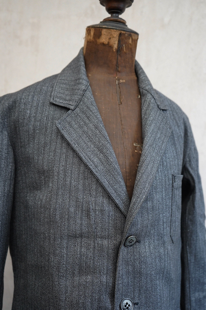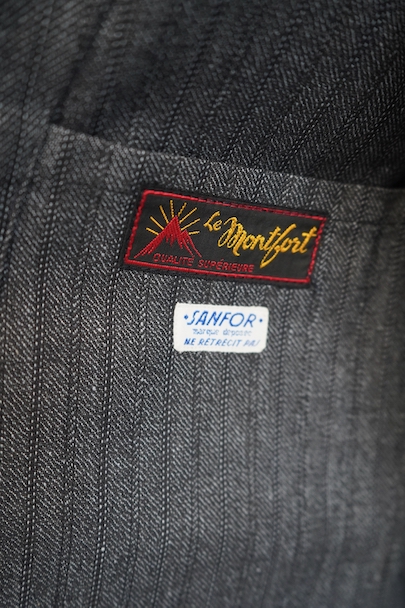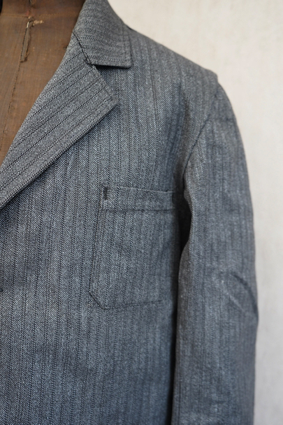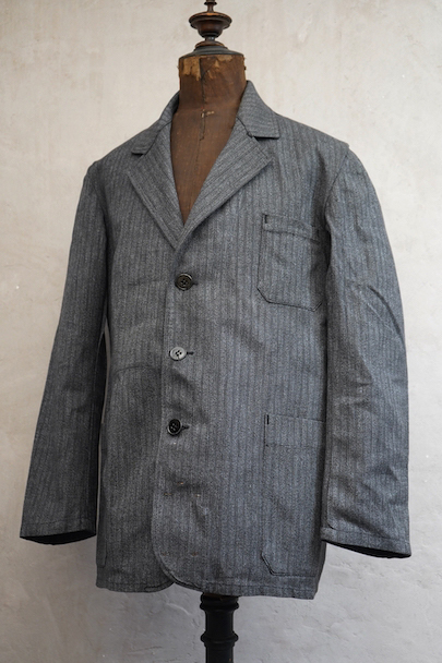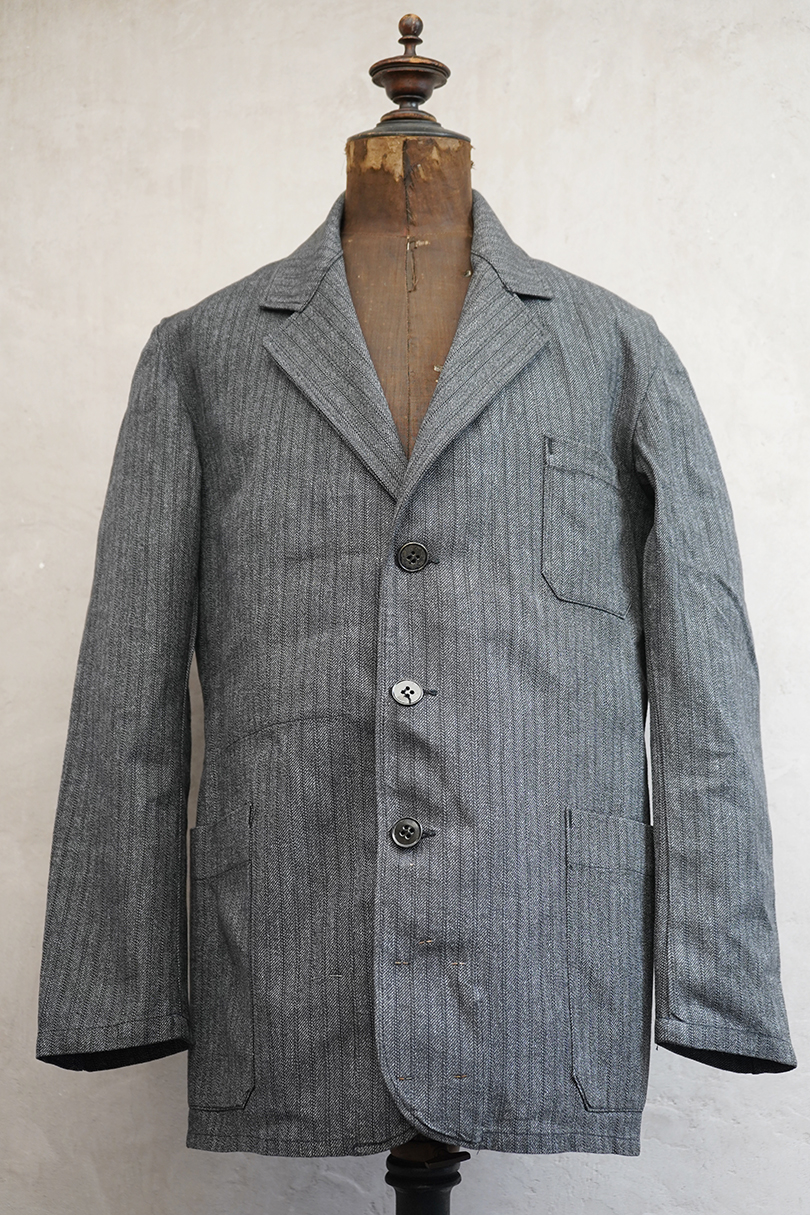 1940年代頃につくられたストライプ織りのごま塩コットン素材のワークジャケット。"Le Montfort"製、未使用品を一度洗濯しています。フロント3つボタン留め、3つのパッチポケット、内ポケットが1つ。ボタンは黒塗りのメタル製、一部塗装はげがあります。紙タグがついていた跡があり、ハリが残っています。保管中の傷みはなく状態は良いです。表記サイズは42です。