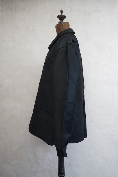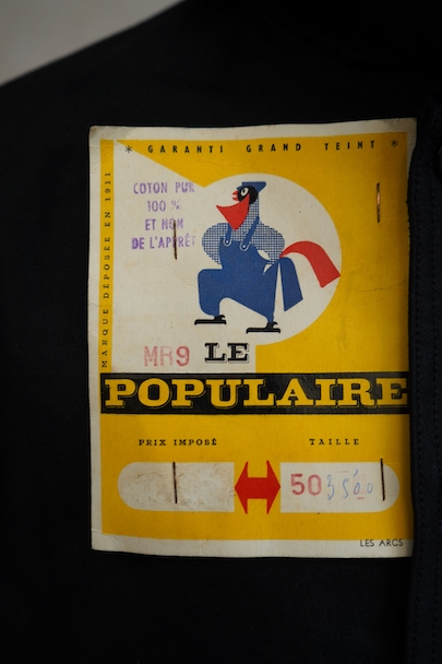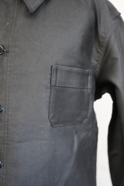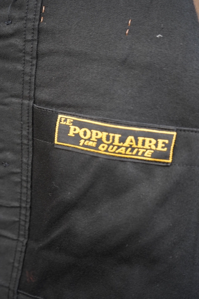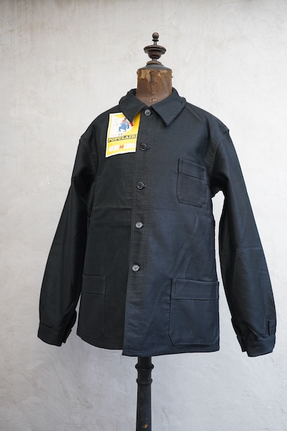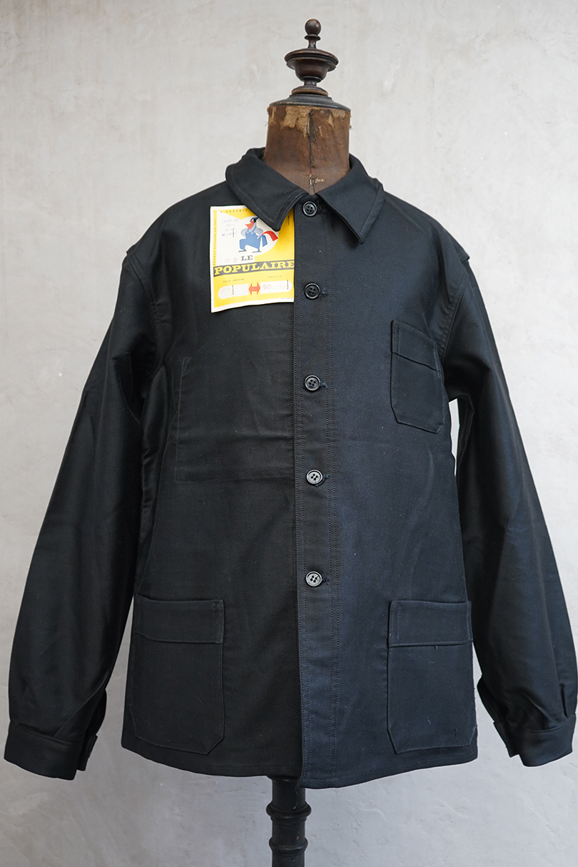 1950年代頃までにつくられたブラック・モールスキン・ワークジャケット。"LE POPULAIRE"製のデッドストック、フラッシャー付きです。織りタグがついています。保管中の傷みはなく、状態は良いです。初めて水通しする際に多少縮む可能性があります。