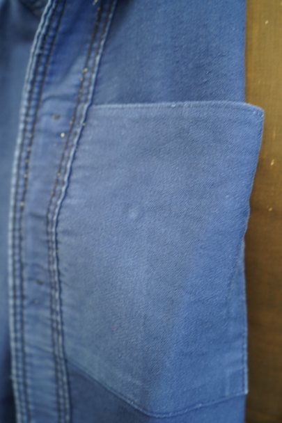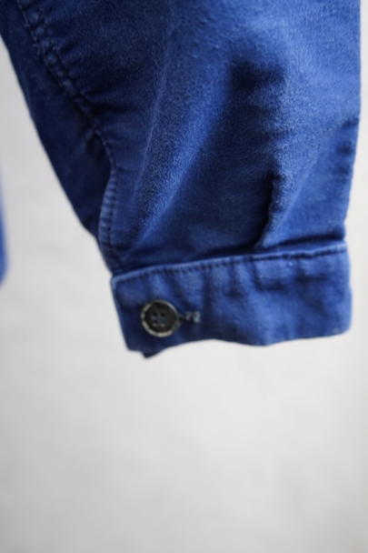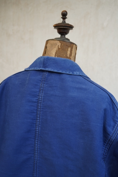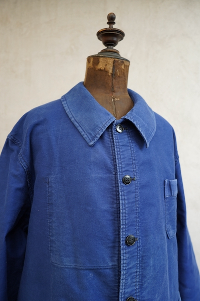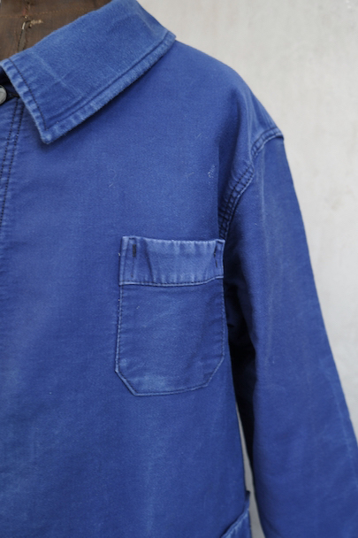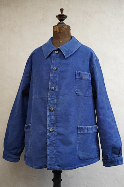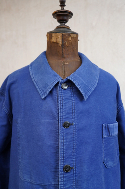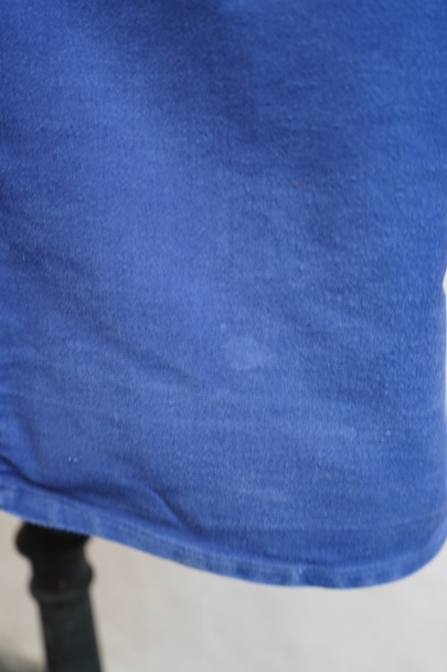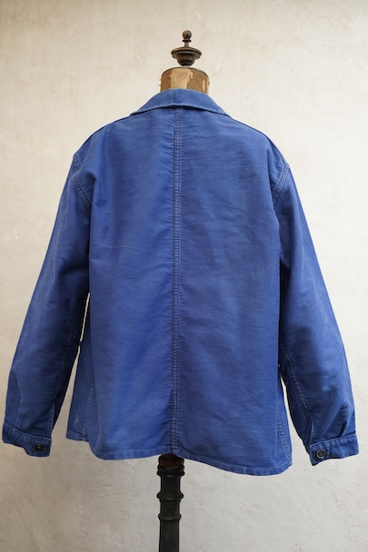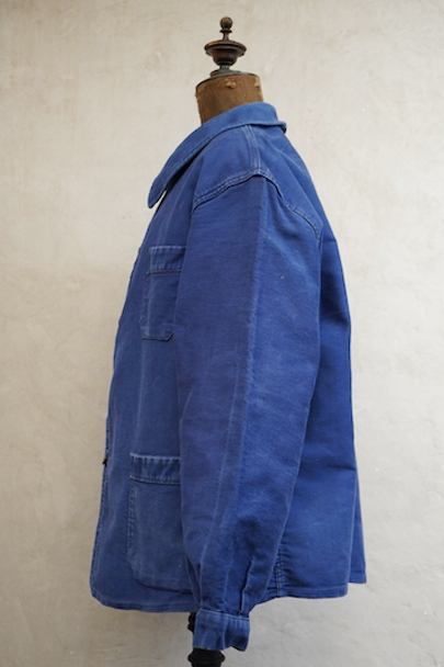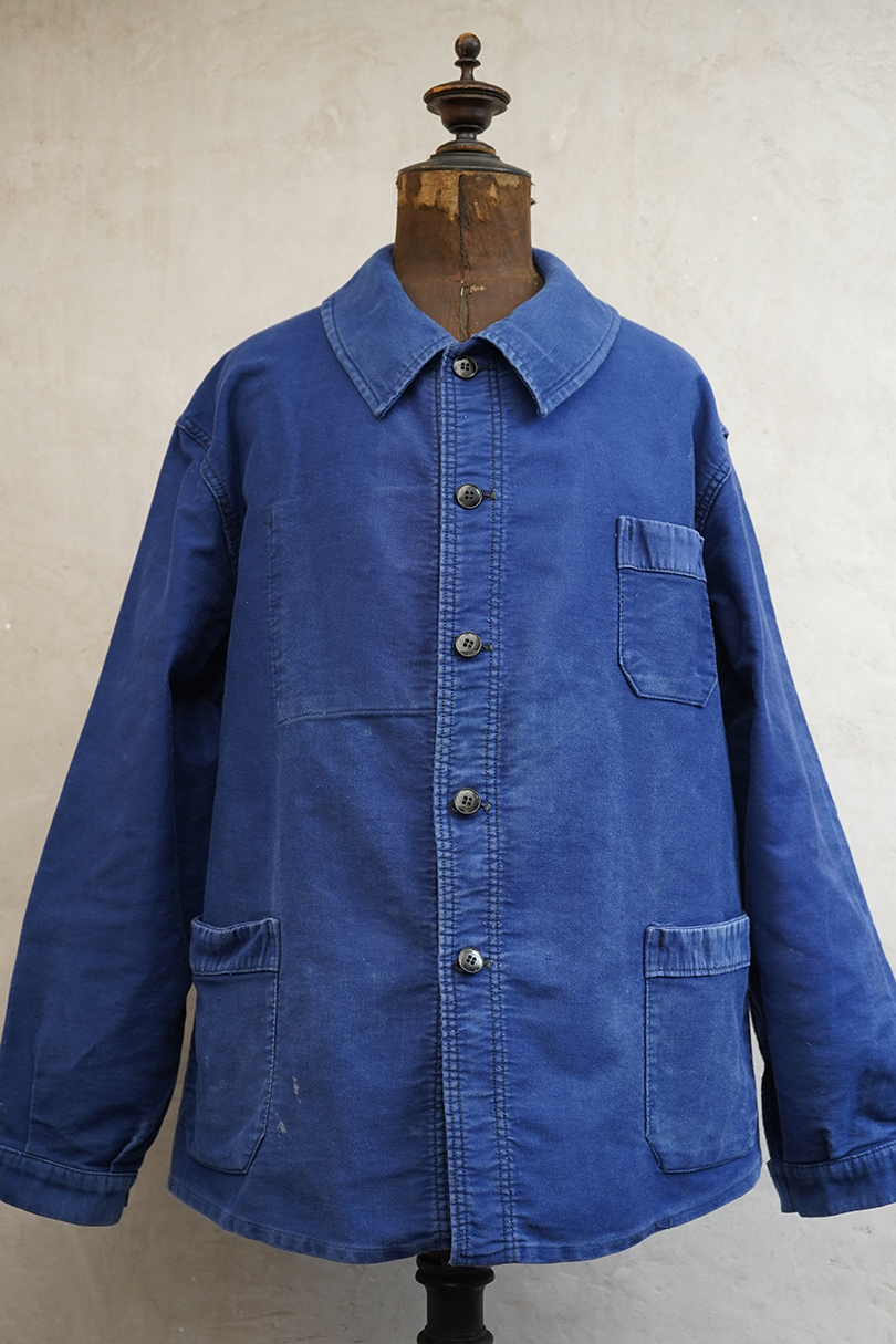 20世紀中期頃につくられたブルー・モールスキン・ワーク・ジャケット。こちらは比較的大きいサイズ、布地は通常のモールスキンよりやや薄く柔らかい生地感です。フレンチ・ワークらしい大きくカーブした襟。所々に塗料のような白い汚れがあります。全体的に多少の擦れやほつれなどはありますが、大きなダメージはないです。
