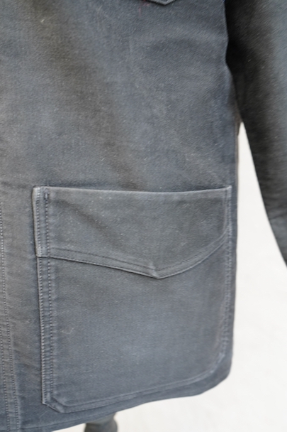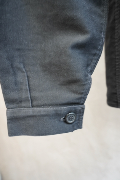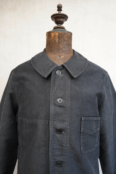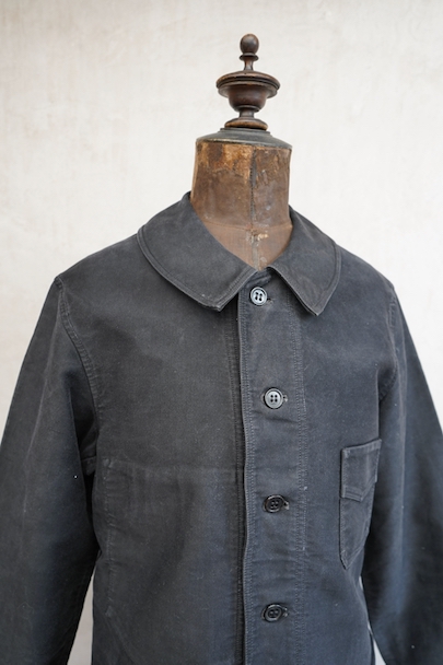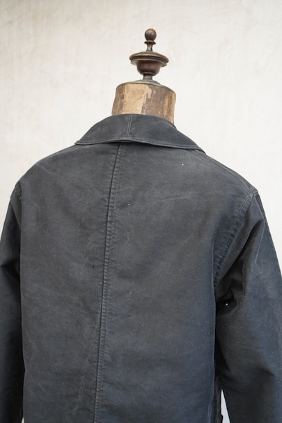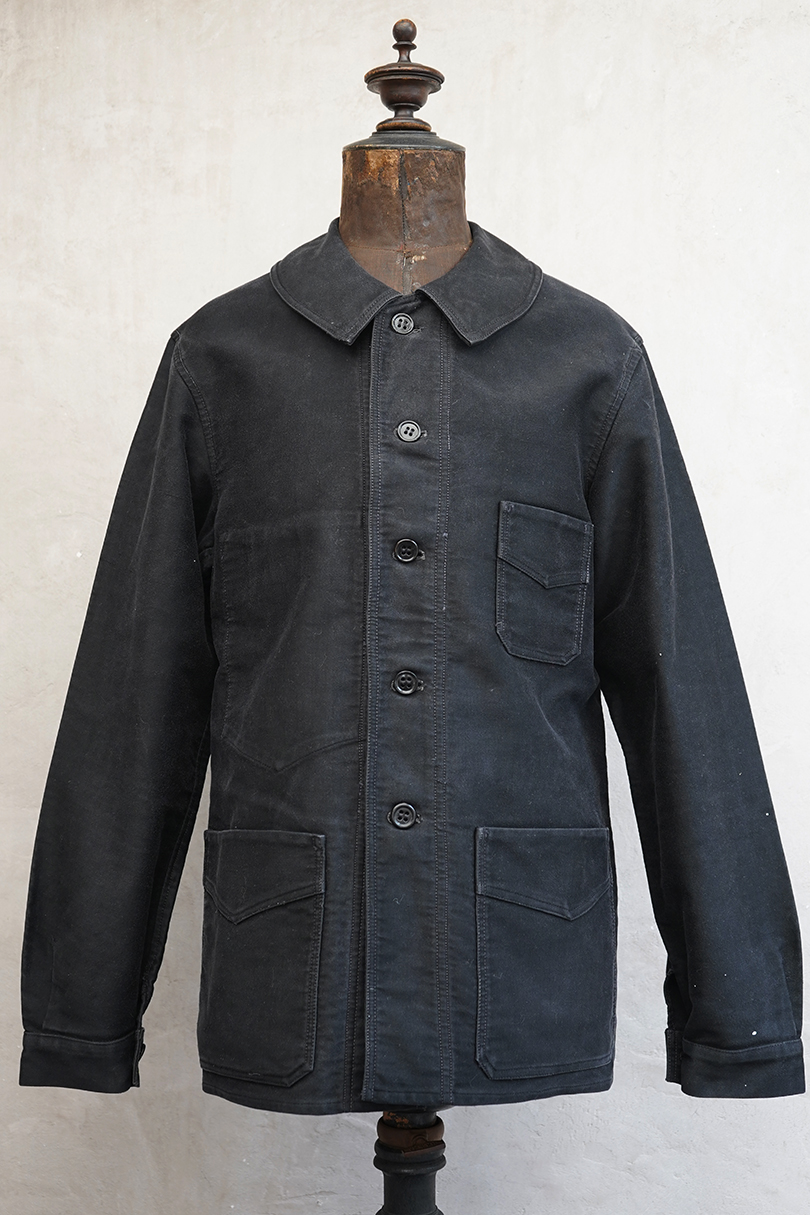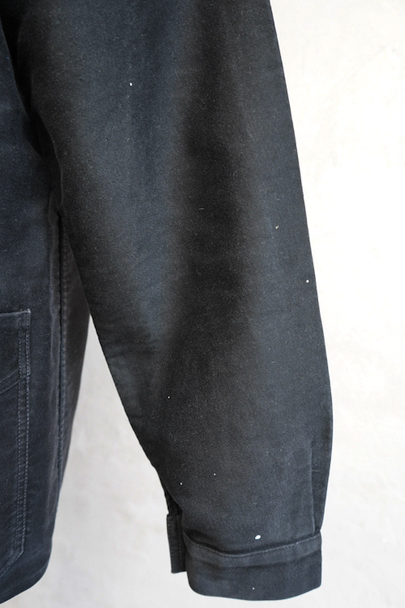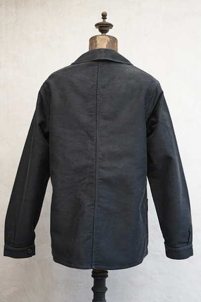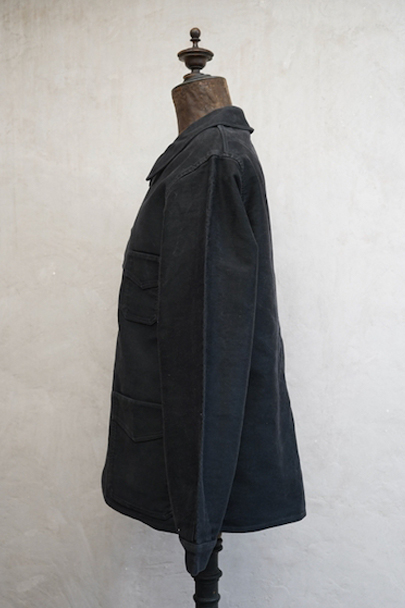 1930年代から1940年代頃につくられたブラック・モールスキン・ワークジャケット。"Le Mont St Michel"製、刺繍タグがついています。フレンチワークらしい丸くカーブした襟、Vポケット、パピエマシェのボタン。内ポケットはホームベース型です。全体的ににポツポツと白い塗料が散っています。バックに小さい傷などはありますが、 使用感は比較的少なく状態は良いです。