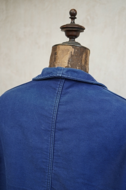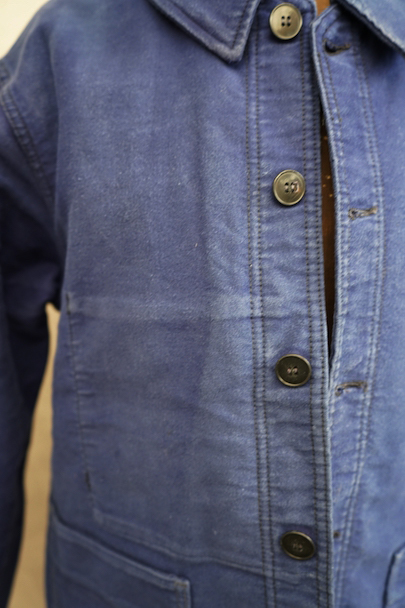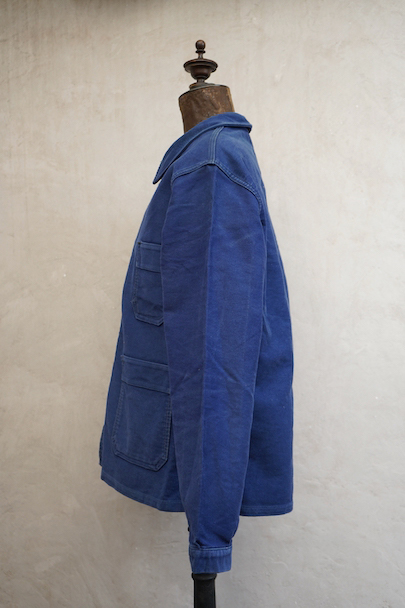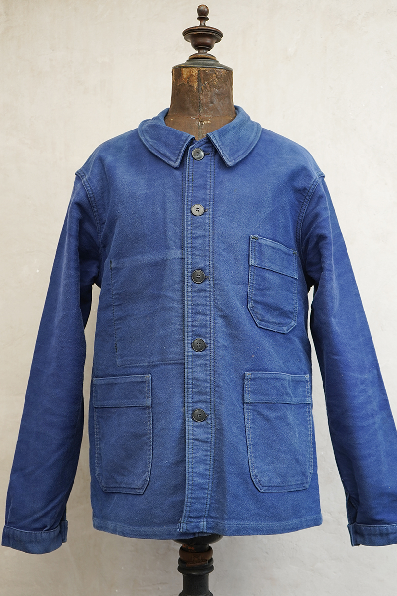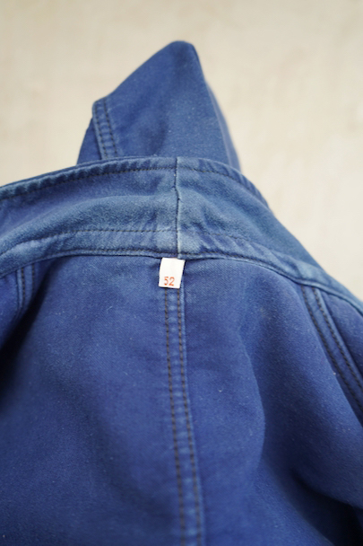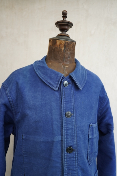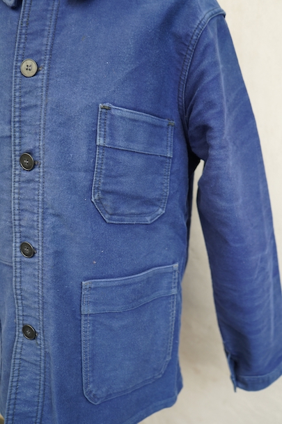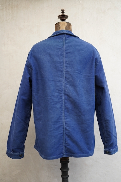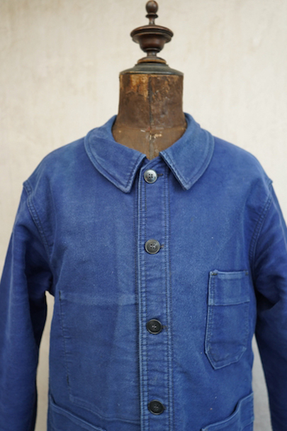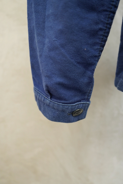 20世紀中期頃につくられたブルー・モールスキン・ワーク・ジャケット。"Le Mont St michel"製、プリントタグ。中厚手のコットン素材。フレンチワークらしい丸くカーブした襟、多少の使用感はありますが、大きなダメージはなく状態は良好です。