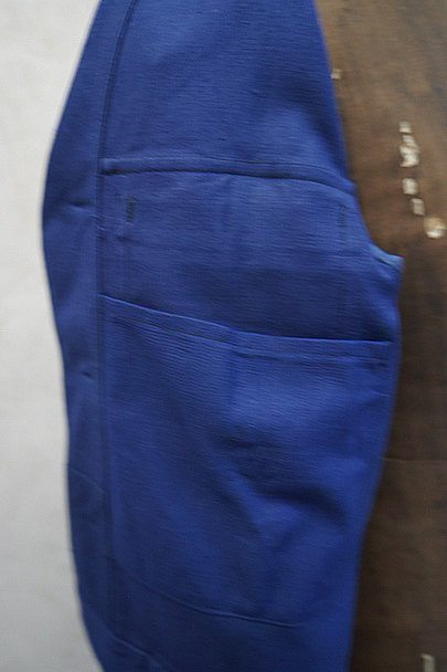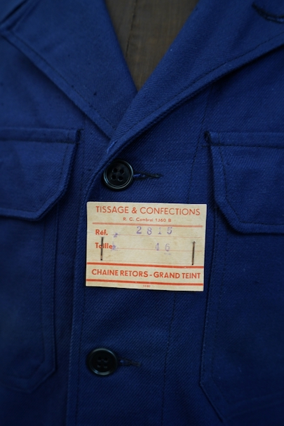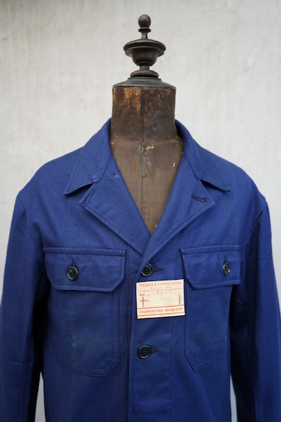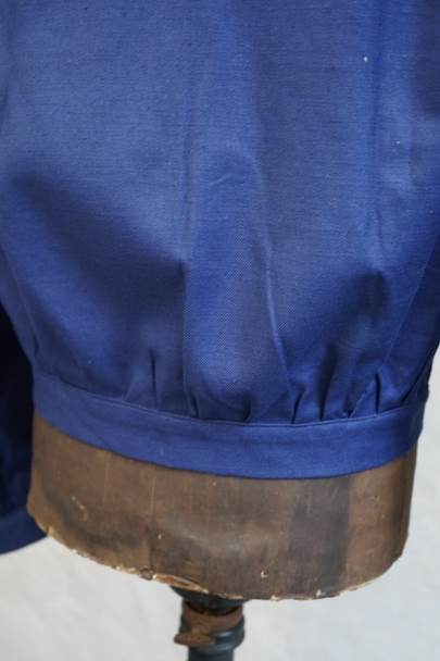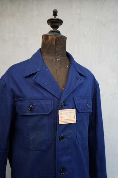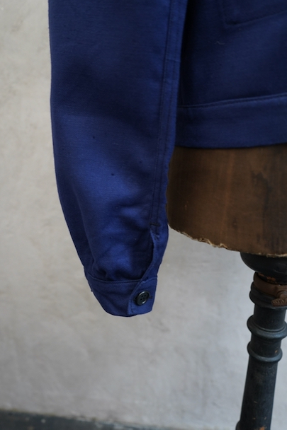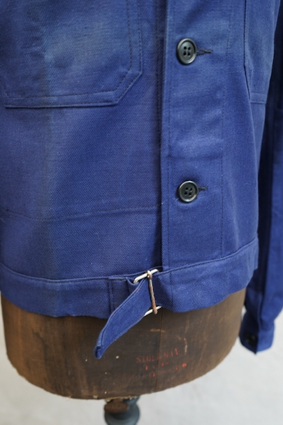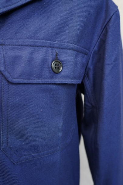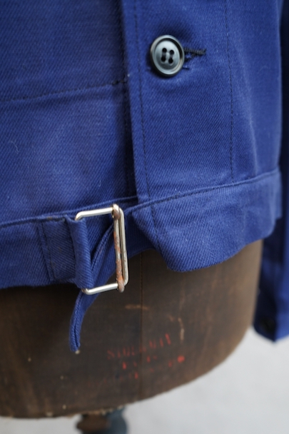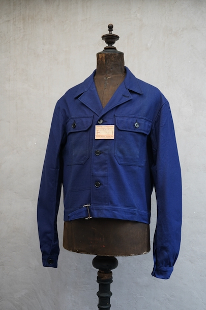 20世紀中期頃につくられたブルー・コットン・ツイルの短丈ワーク・ジャケット。デッドストックを一度洗濯しています。紙タグ付き、表記サイズは46です。表胸に大きめのボタン留めフラップ・ポケット。裾部分はベルトで締めれます。中央あたりに少し色焼け、金具にサビがあります。その他の状態は良いです。